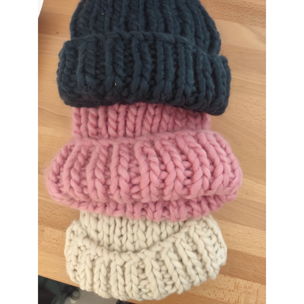 Čepice s bambulí. Máme ve třech barvách krémová, tmavě modrá, Růžová. Čepice jsou obrendovány jednoduchým logem bioga.