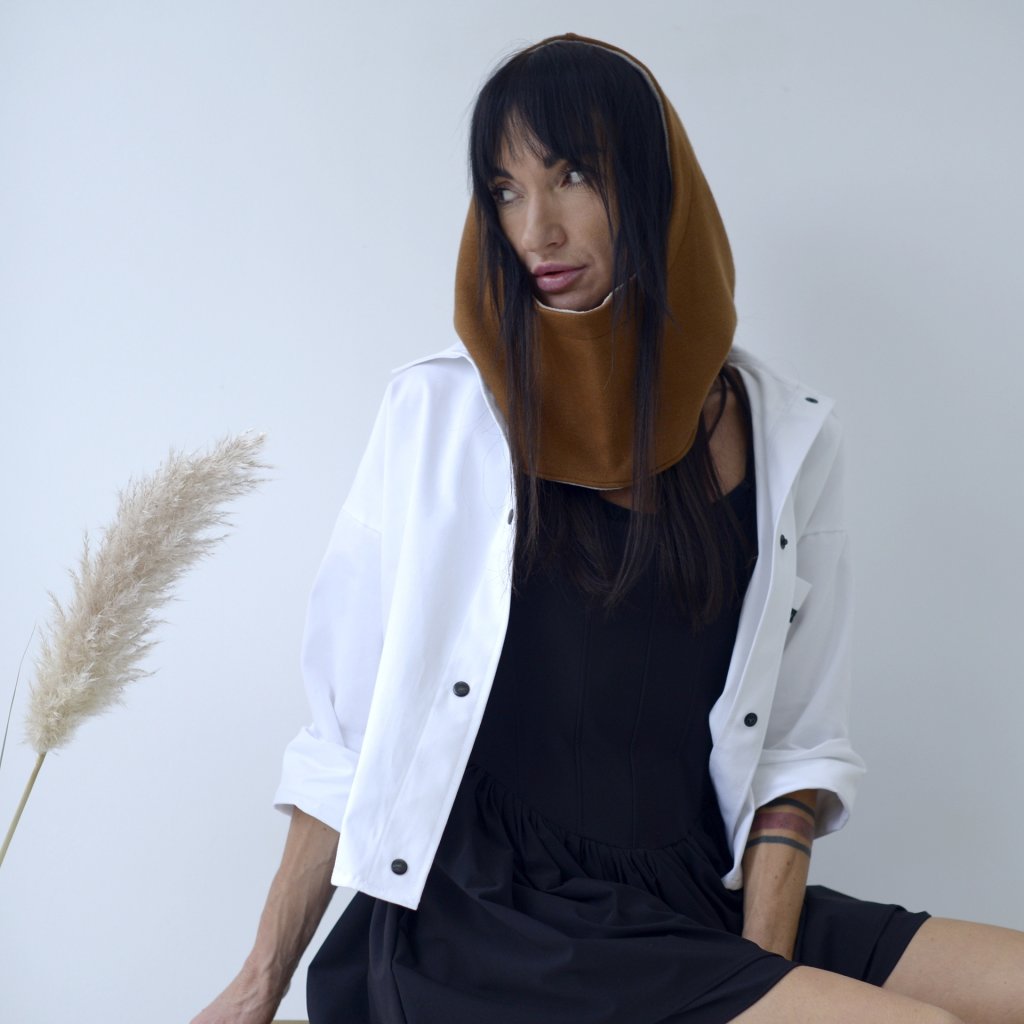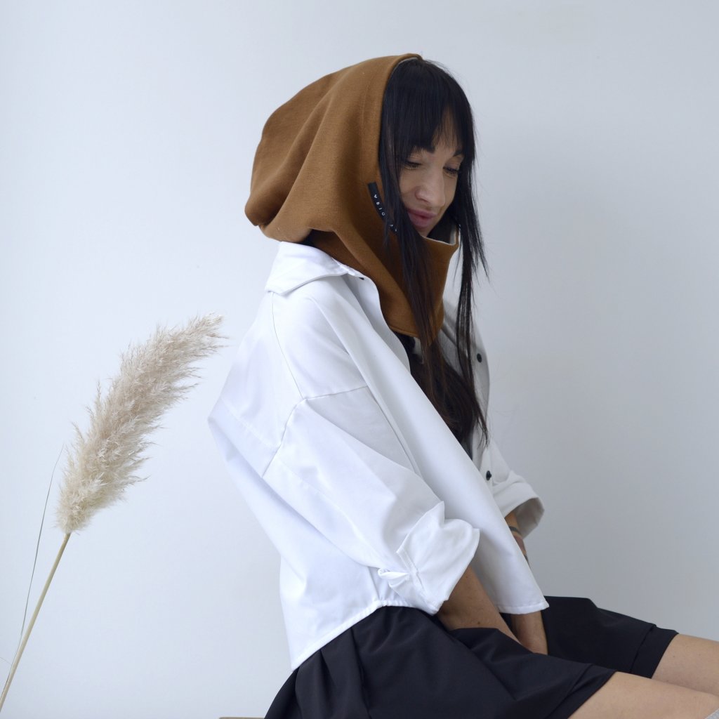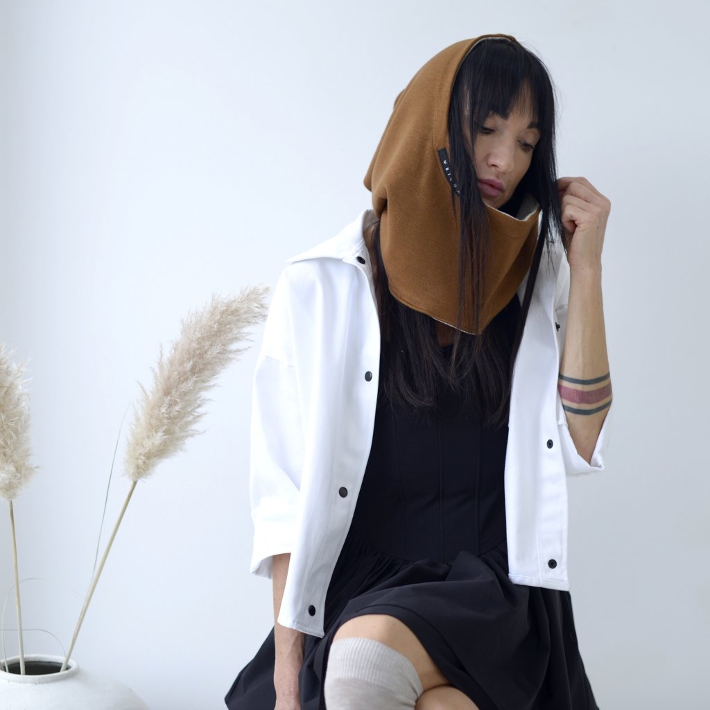 Taková kapuce- čepice nákrčník v jednom v spíš neitrálních tonech + černá. Skvěle se doplnují s mikinami jak s kapucí tak bez. Nebo si vytvořte sexy outfit s krátkými šatičkami kozačky podkolenky a k tomu velký vlněný oversize svetr. Možnosti a tipy na outfity Vám brzy představíme.