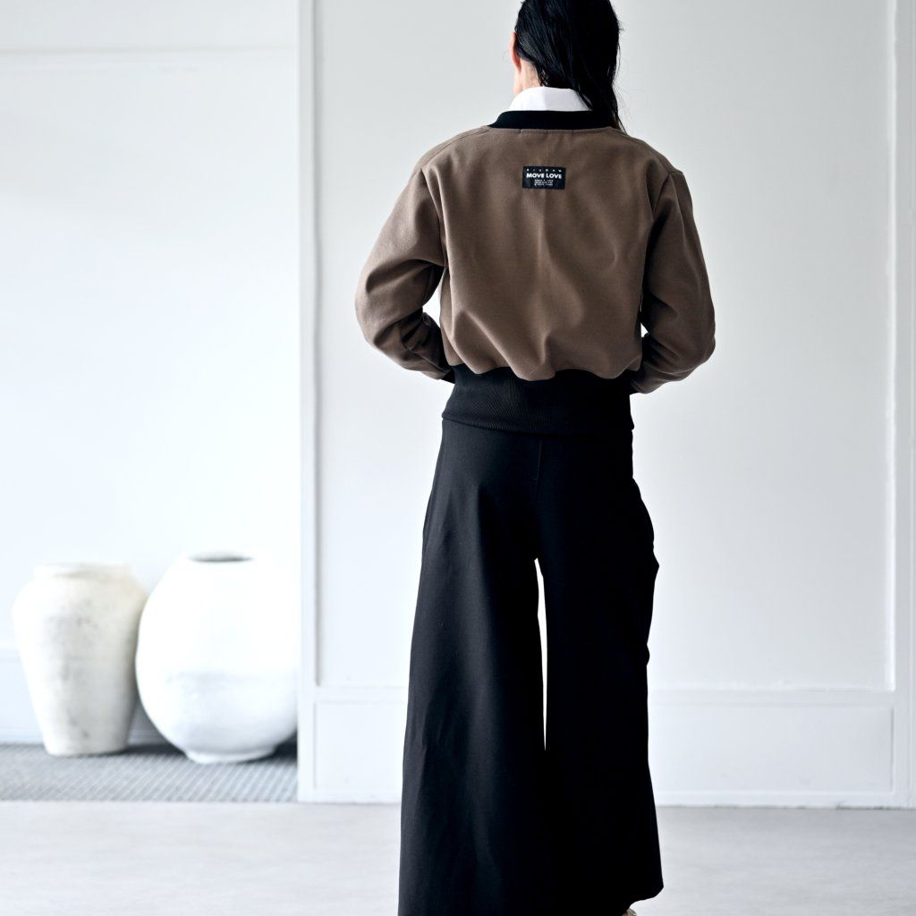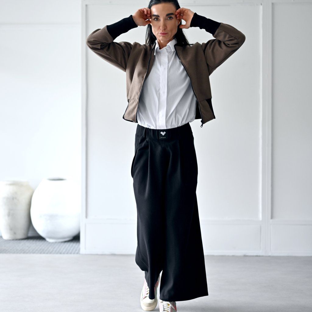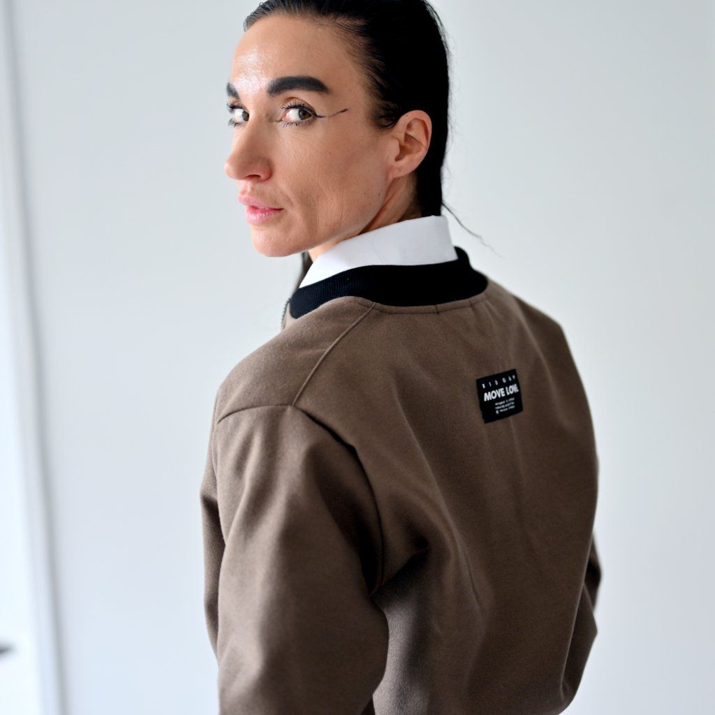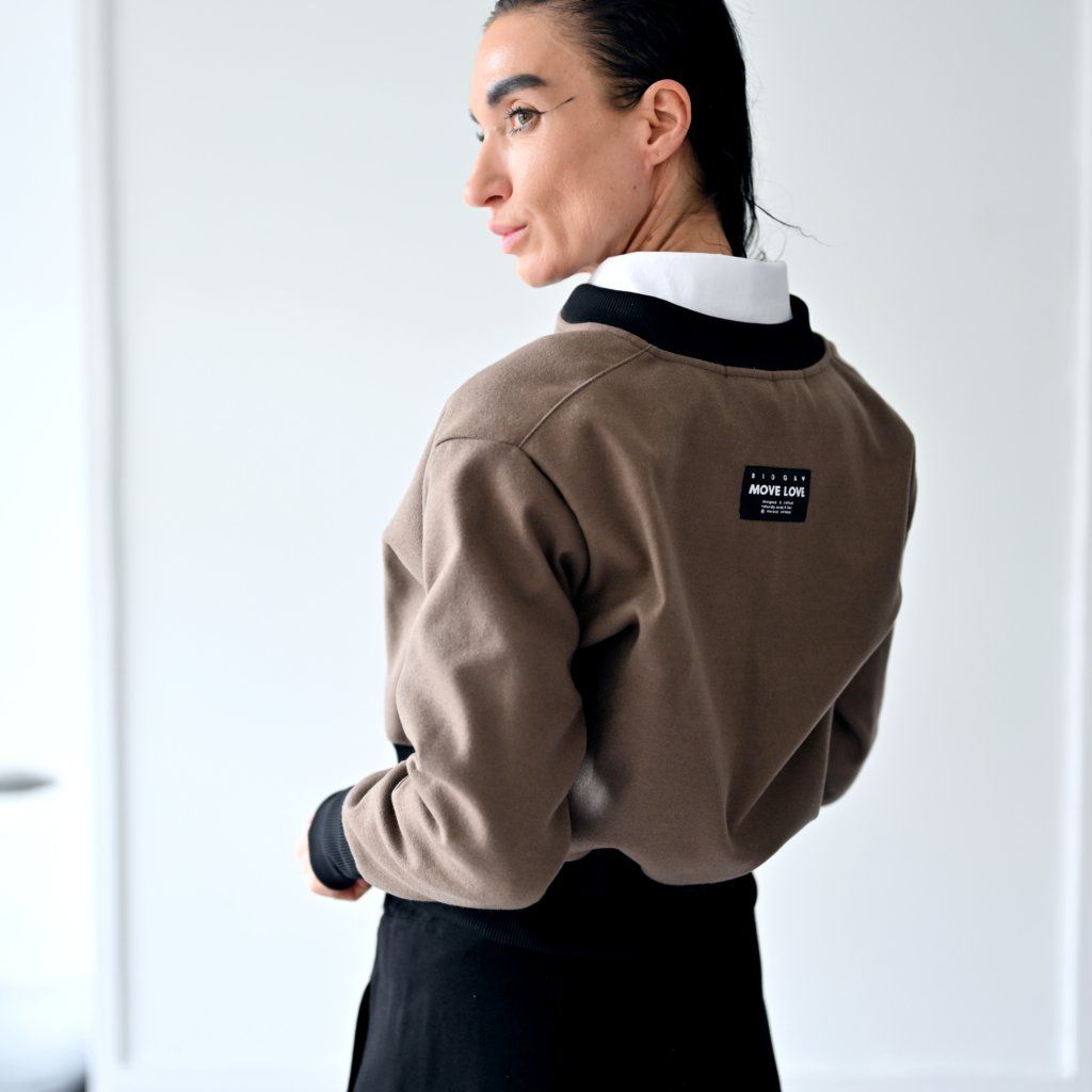 Dominantním prvkem je prodloužené žebro v pase, které jemně tvaruje linii těla, a dlouhé manžety na rukávech, které vytváří charakteristický, lehce designový výraz. Celek drží čistý zip, který neruší a zachovává minimalistický dojem. Kontrastní žebrované náplety barevně ladí se zemitou barvou.