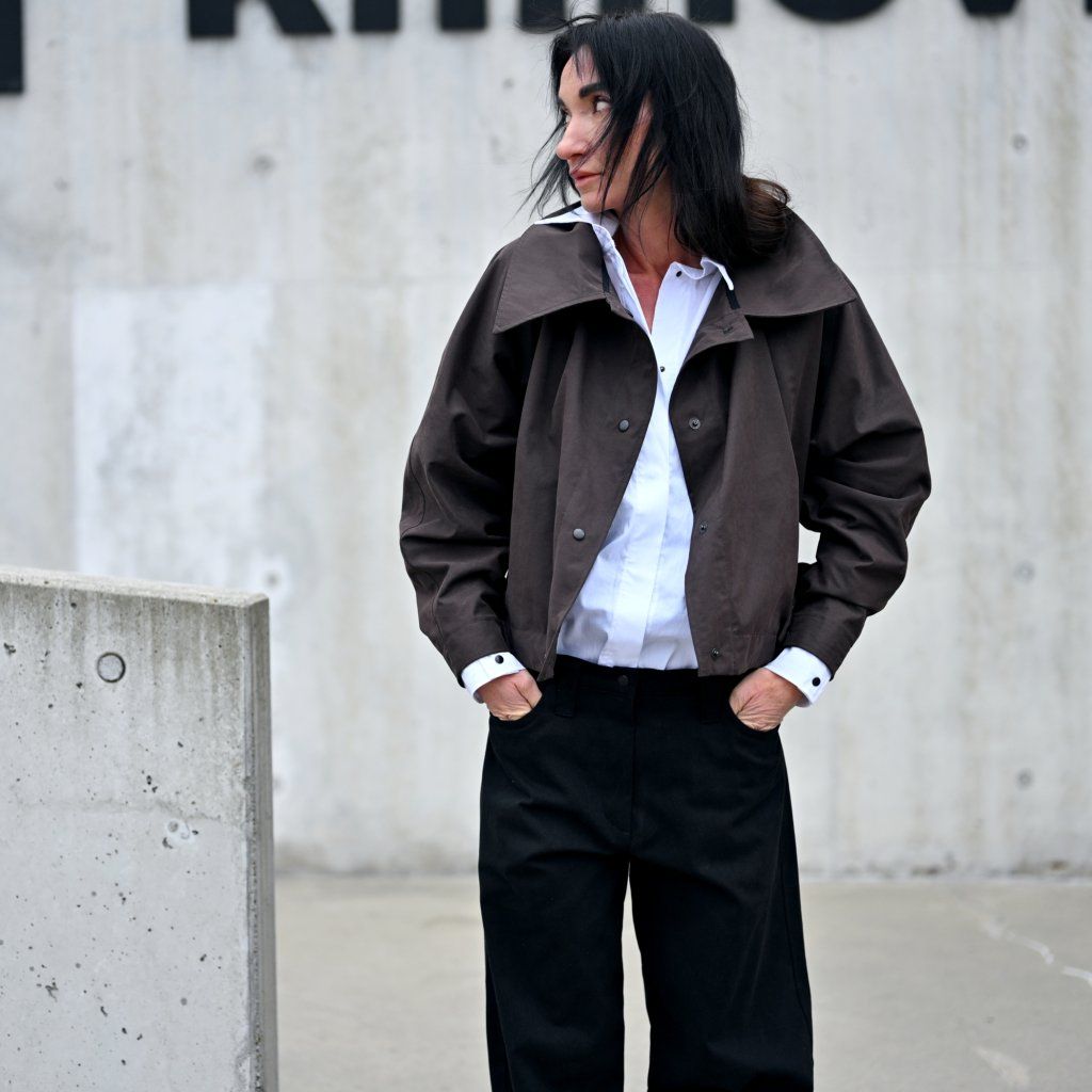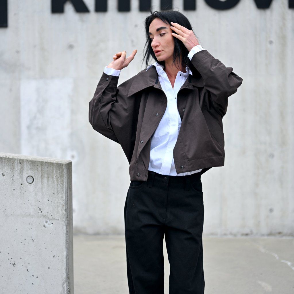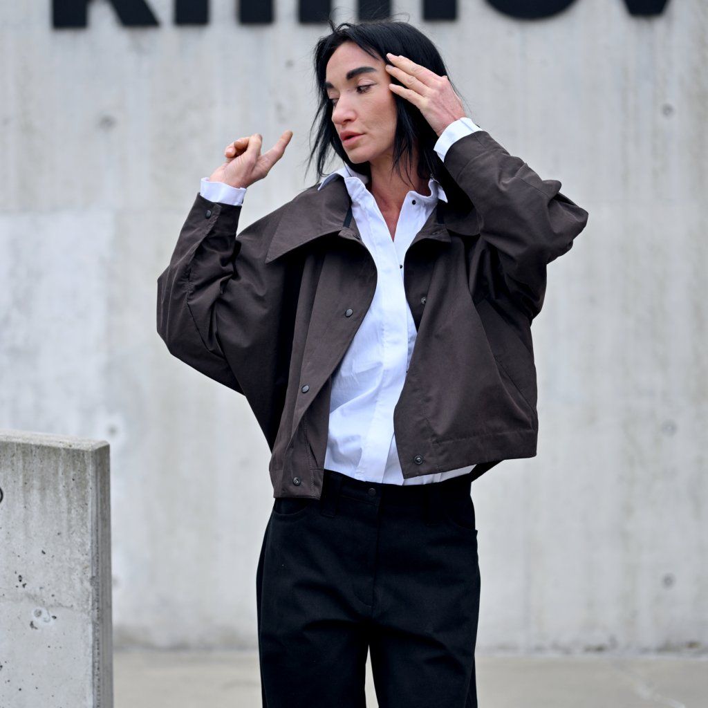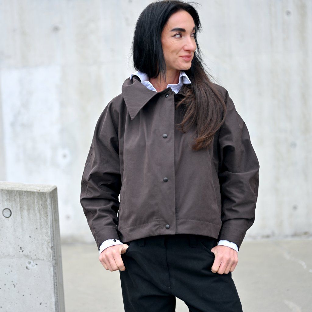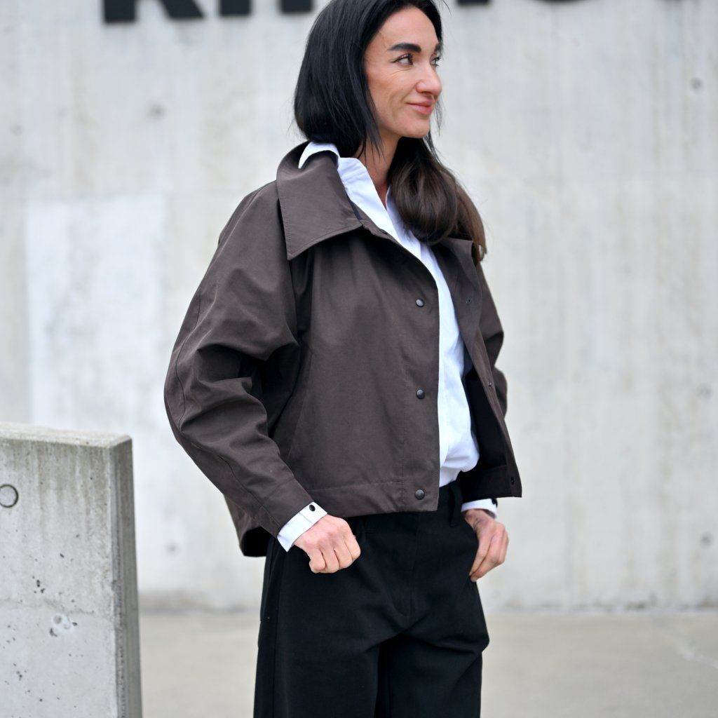 OLVIDA podzimní lehčí bunda- trenčkot cropp z pevnějšího pláštovky, v oversize střihu, přední díl je mírně vykrojen a zadní díl delší do balonového tvaru, unikátní střih tomu dává originalitu a nadčasový design. Zapínání na patentky. A výrazným prvkem je velký límec a lištová kapsa nádherně zapadne do designu.