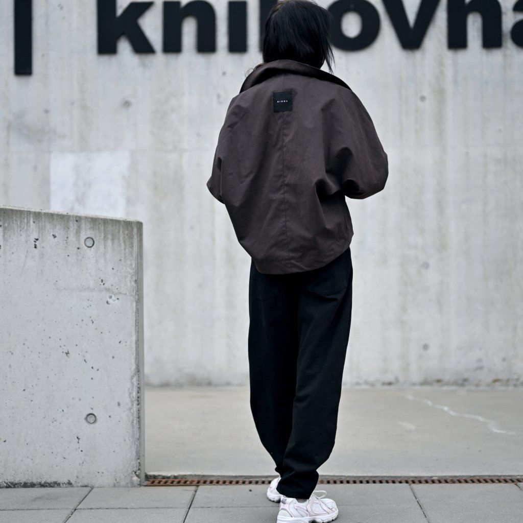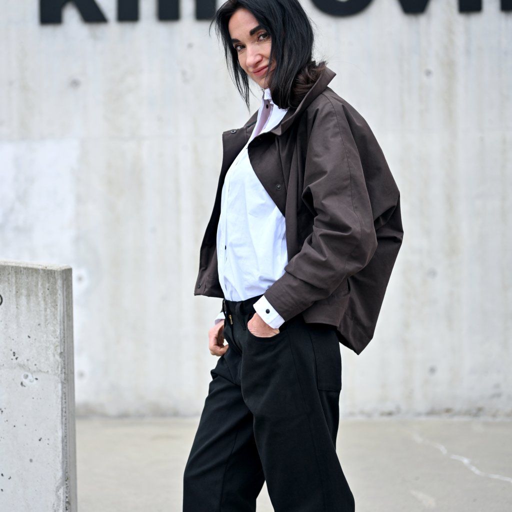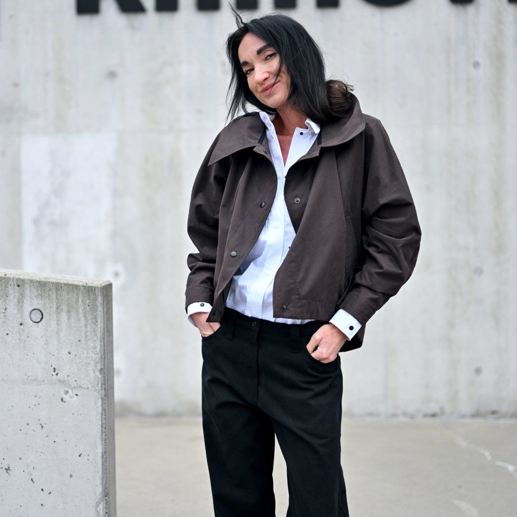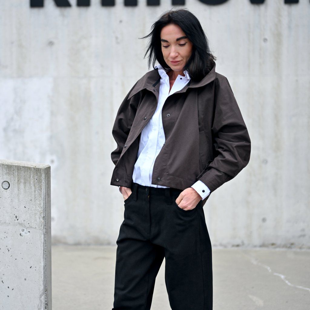 OLVIDA podzimní lehčí bunda- trenčkot cropp z pevnějšího pláštovky, v oversize střihu, přední díl je mírně vykrojen a zadní díl delší do balonového tvaru, unikátní střih tomu dává originalitu a nadčasový design. Zapínání na patentky. A výrazným prvkem je velký límec a lištová kapsa nádherně zapadne do designu.