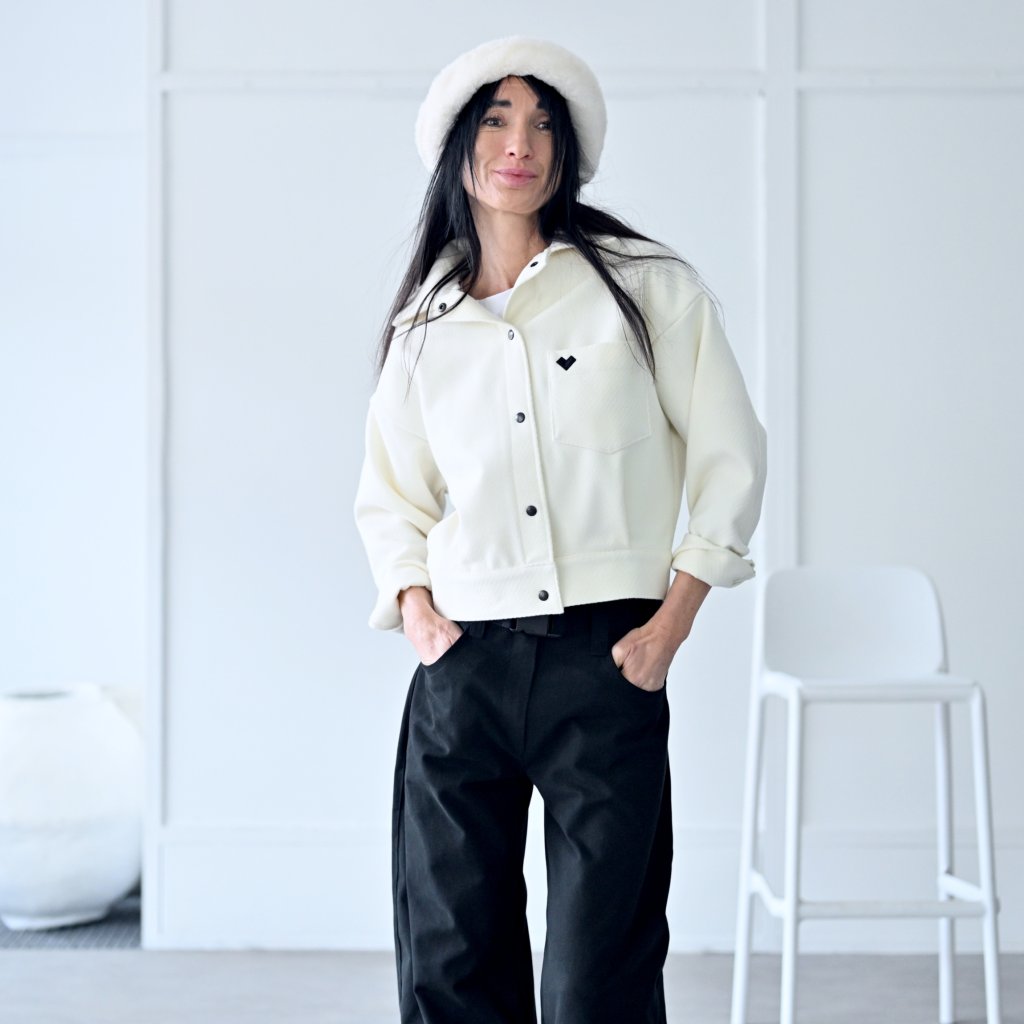 PUEDO svrchni vlněná bunda. Kratší délka zakončená do manžety, zadní díl s jemnými sklady.