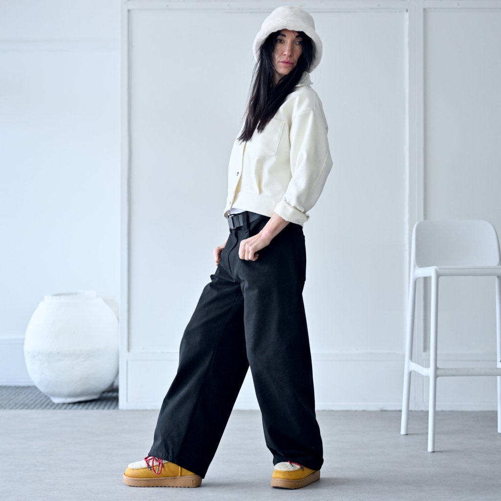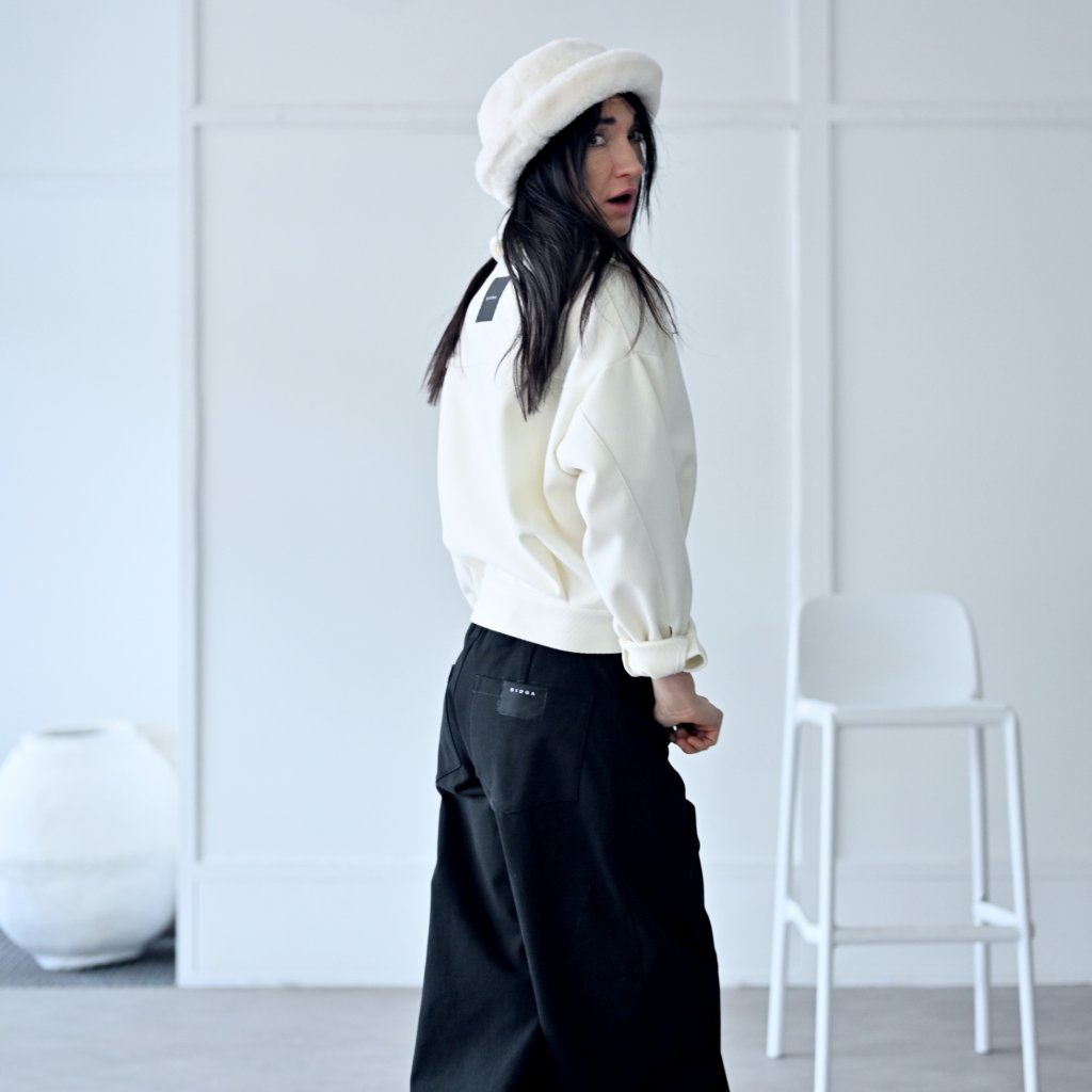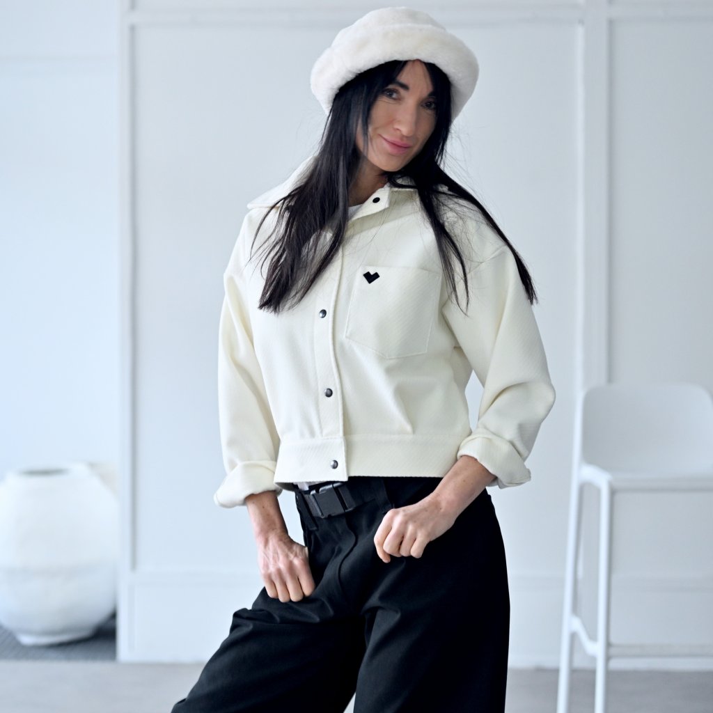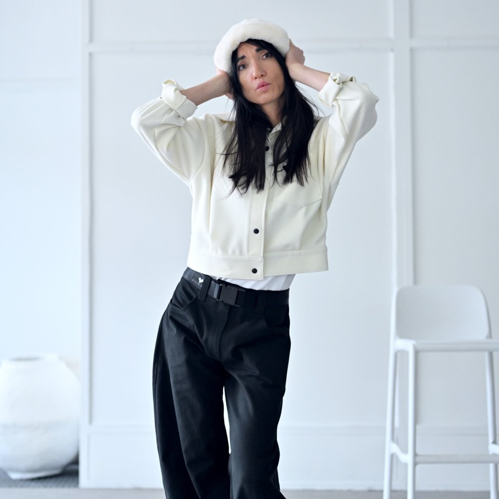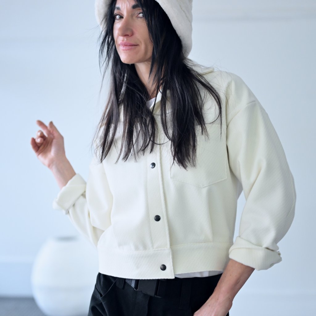 Lehce do oversize střihu, dlouhý rukáv se zapínáním na kontrastní černé patentky, límec je lehce vytužený, zapínání na černé patentky.