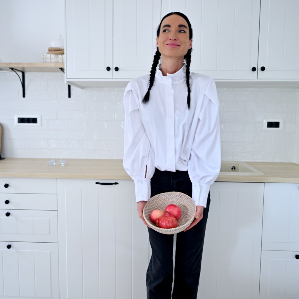 Košile Evaluna - je naší žhavou novinkou. Slušná elegantní košile s jemně nabíraným, dlouhým rukávem na zapínání patentkami. Límeček do stojáčku.