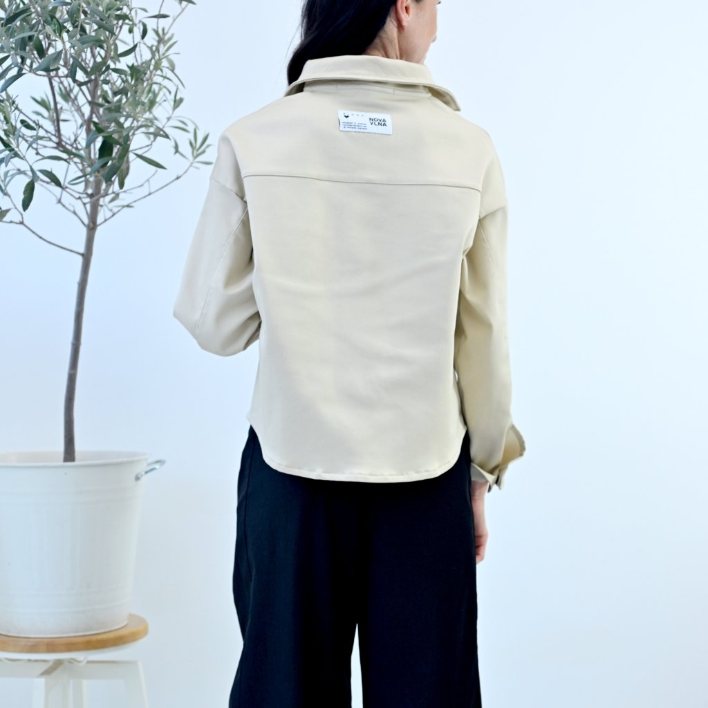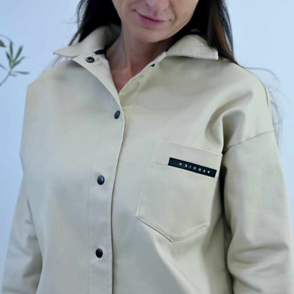 Košile PROXIMA z pevnější bavlna- s keprovou úprvavou. Klasický střih, lehce oversize, dlouhý rukáv se zapínáním na kontrastní černé patentky, límec je lehce vytužený, zapínání na černé patentky .
