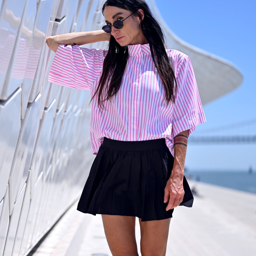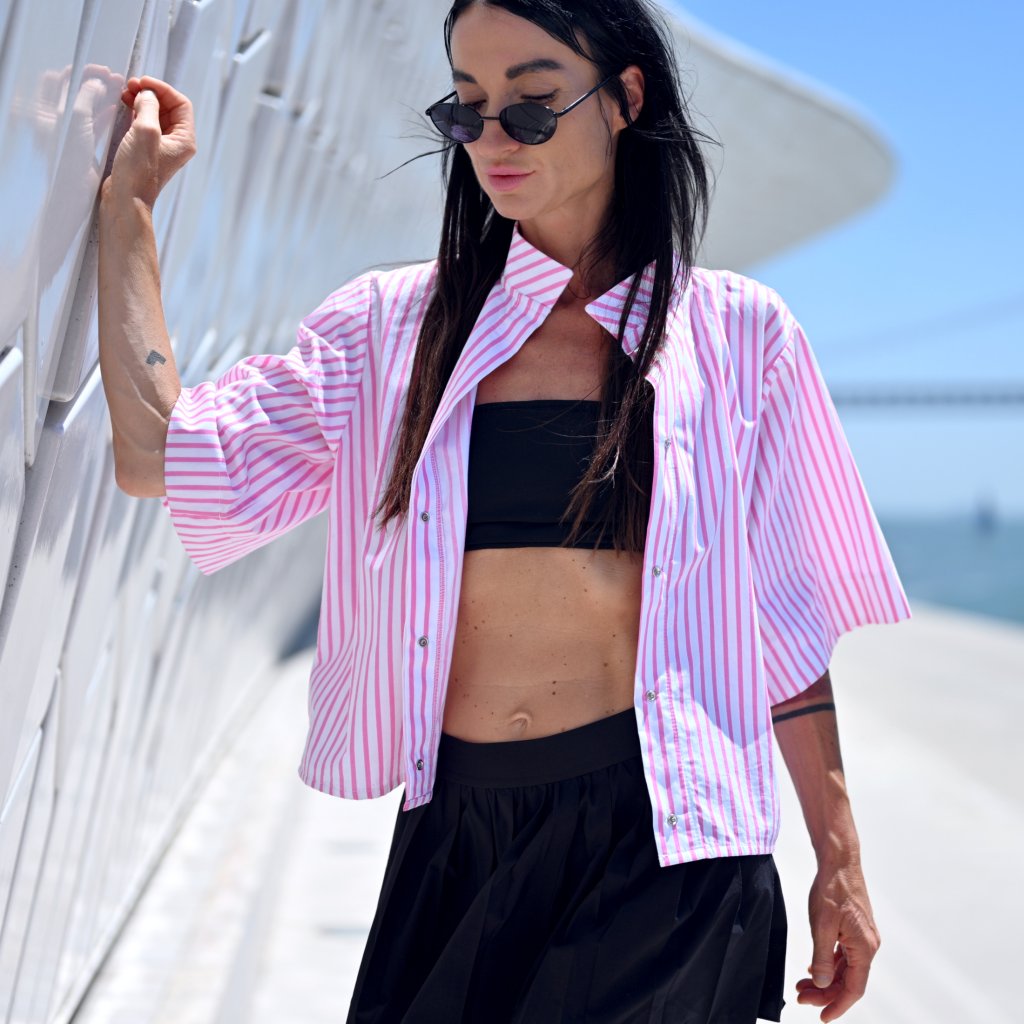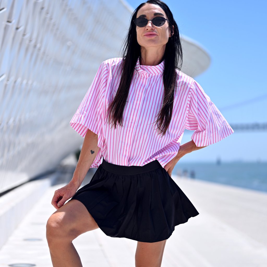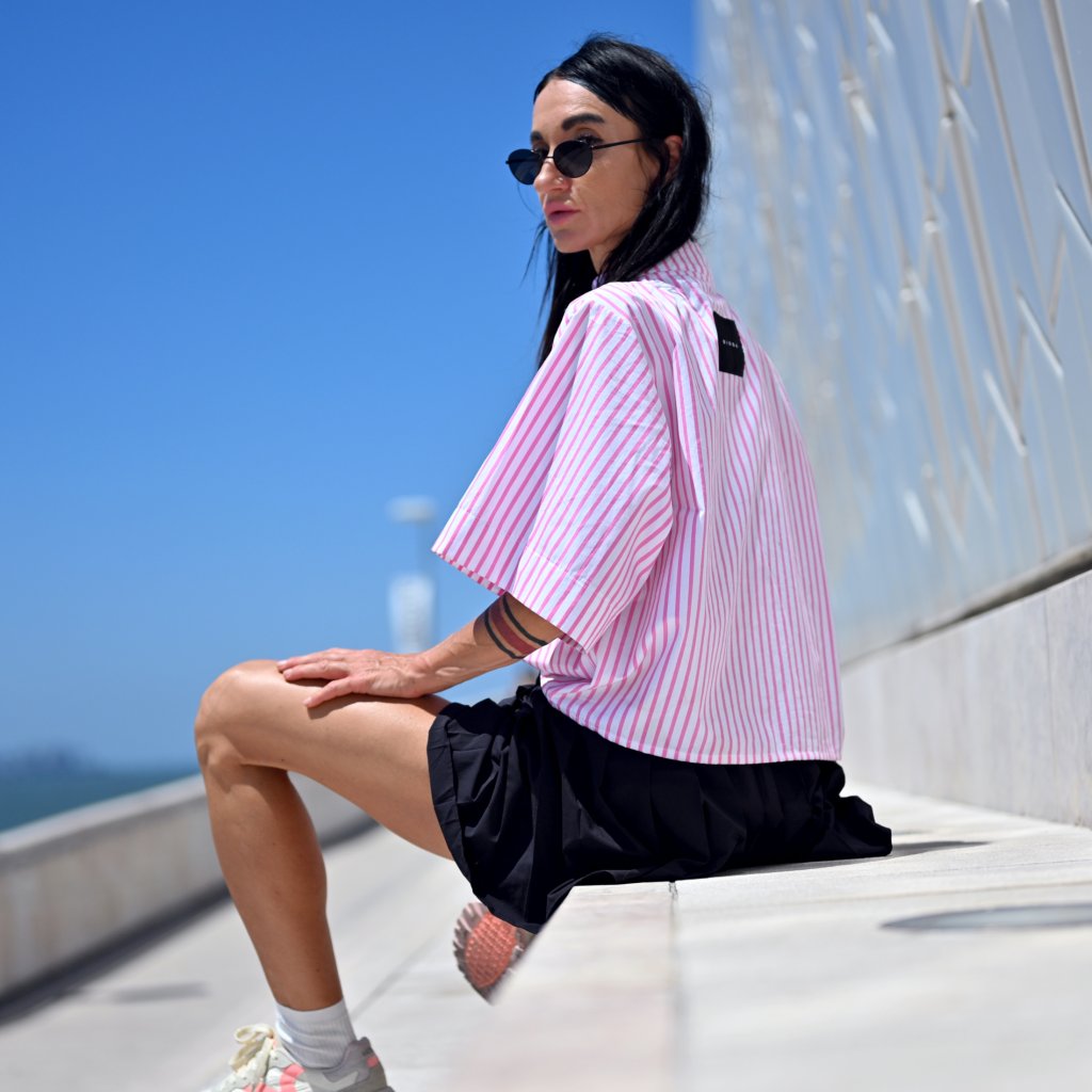 Košile LISBOA v oversize střihu, límec do stojáčku, skryté zapínání na patentky, širší pohodlný rukáv po loket.
