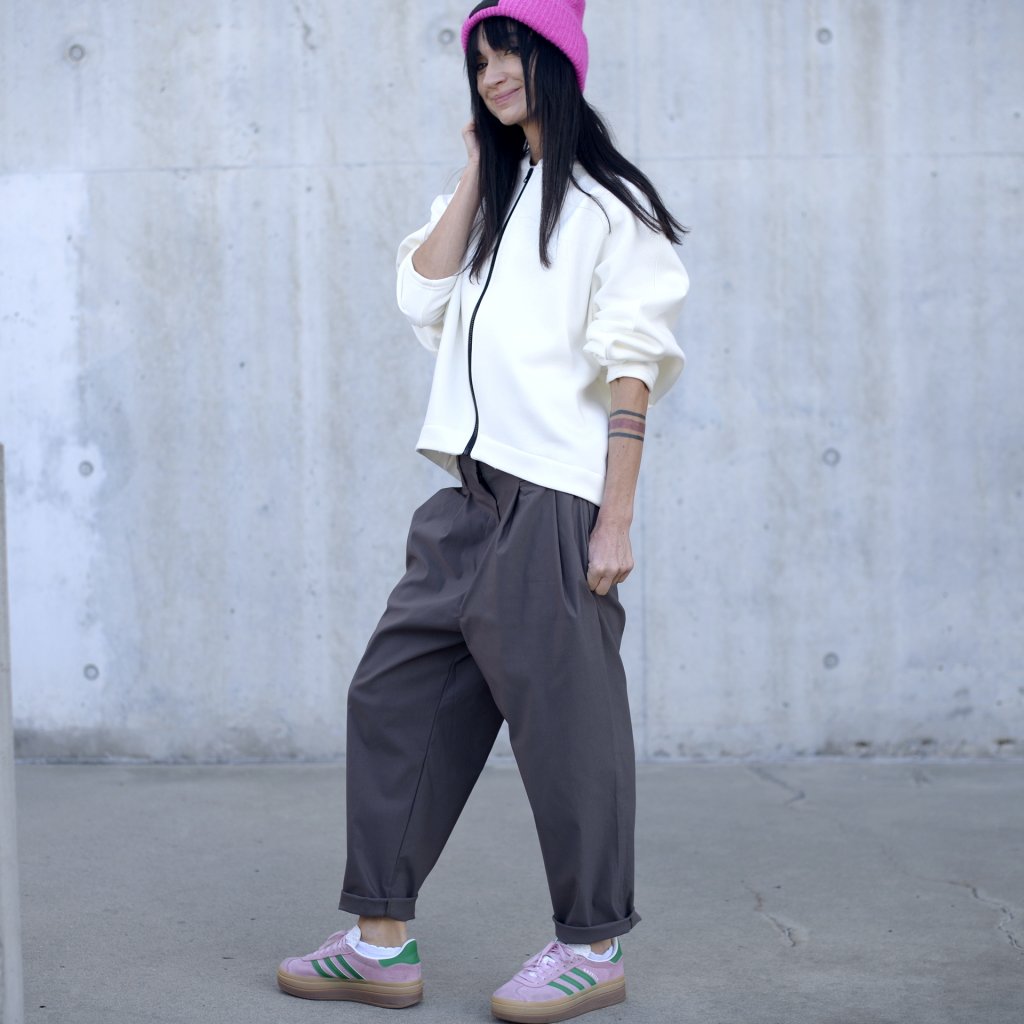 PERDONA MIKINA NA ZIP v počesaném materiálu, v oversize střihu, přední díl je mírně vykrojen a zadní díl delší do balonového tvaru, unikátní střih tomu dává originalitu a nadčasový design. Zapínání na zip. Bomberový límec z pružného žebra.