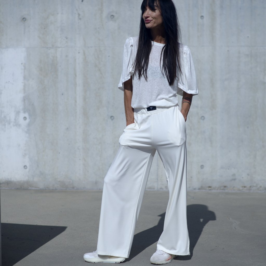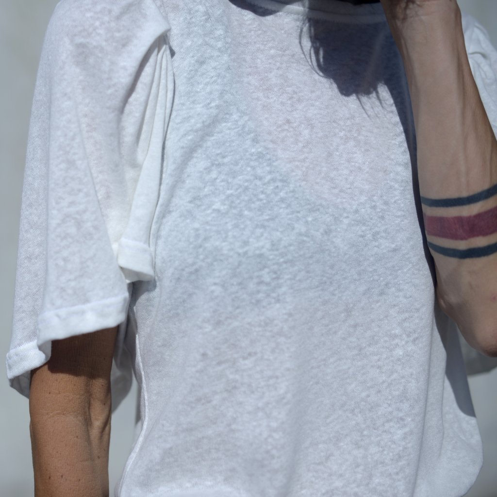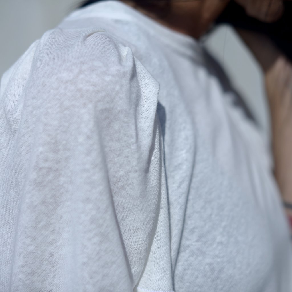 Top VOLVER s extra nadýchaným rukávem z lněného vizkozového lehkého úpletu. Pas lehce projmutý, prodloužená délka.