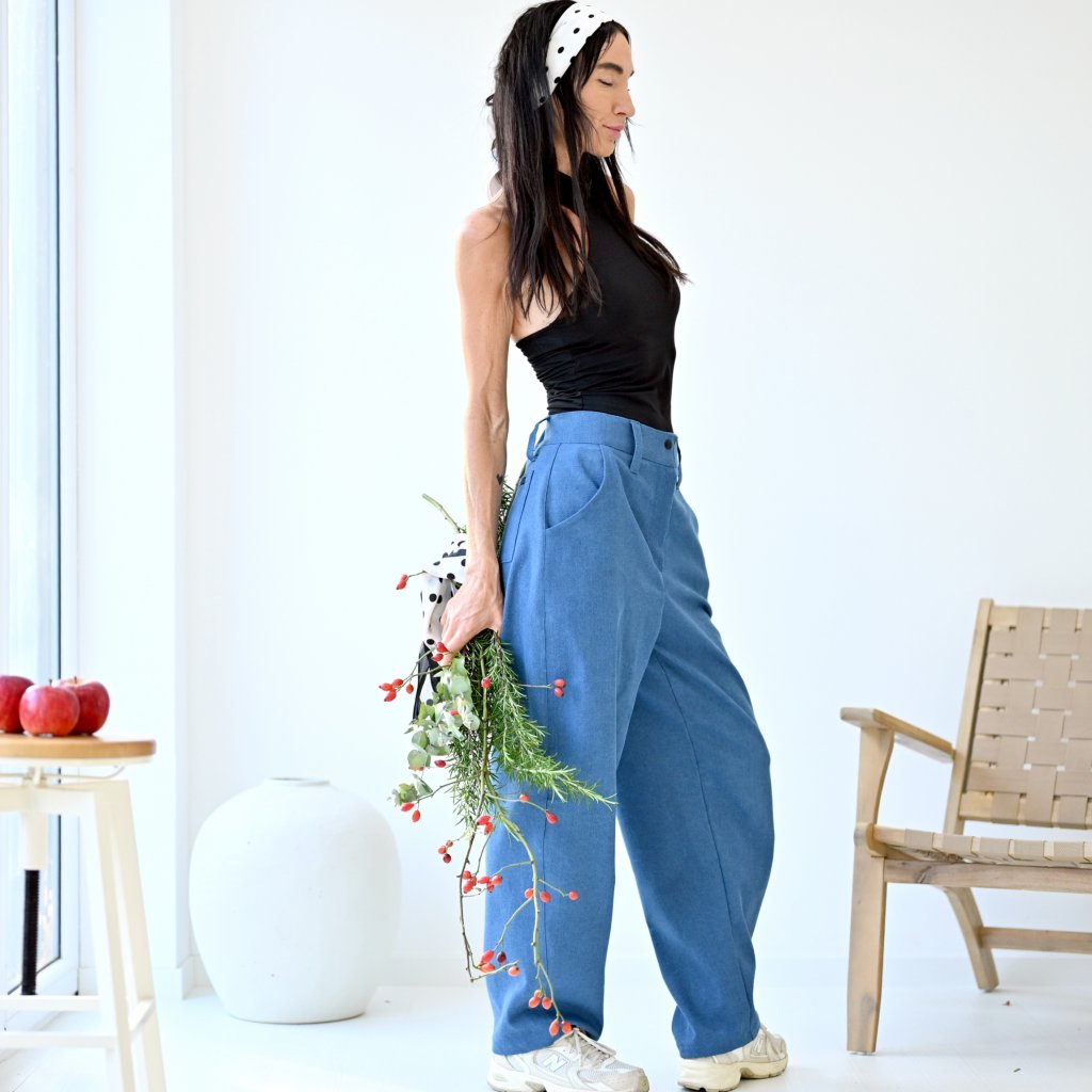Kalhoty KOMODO "pohodlí a styl v jednom" barelové volnější kalhoty z JEANSOVÉ bavlněné tkaniny s kapsami, pas je zřasen do pružné gumy, kalhoty jsou na zip + patentka. široké nohavice zúžené ve spodní části, všitý pruh dodává originální baggy look lichotící většině typům postav.