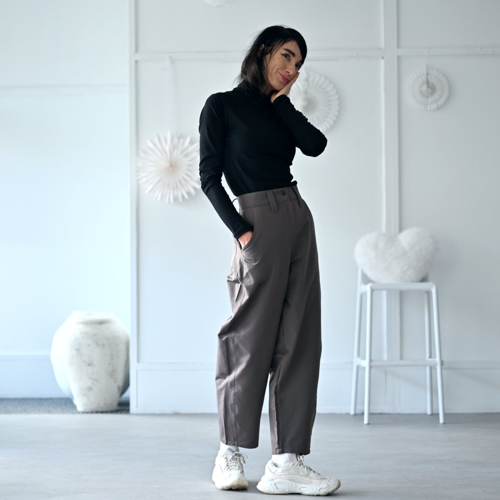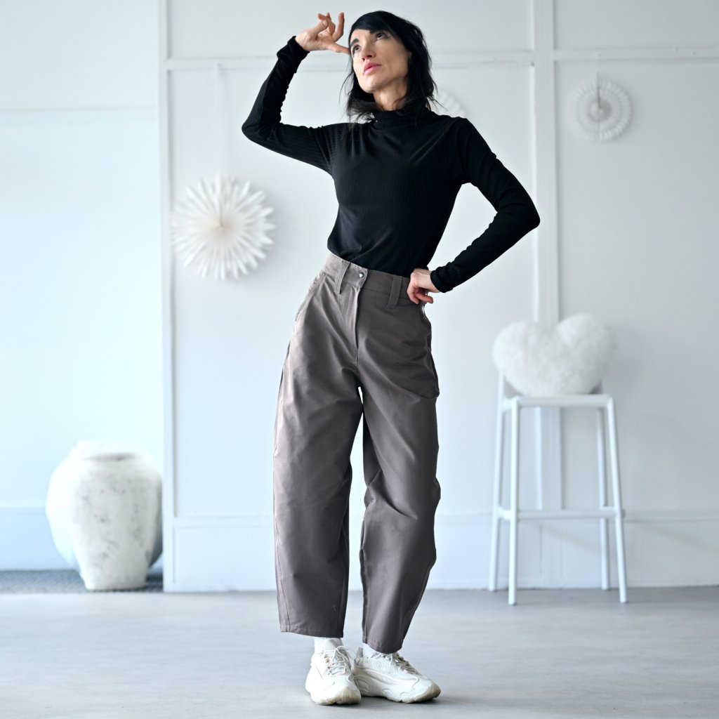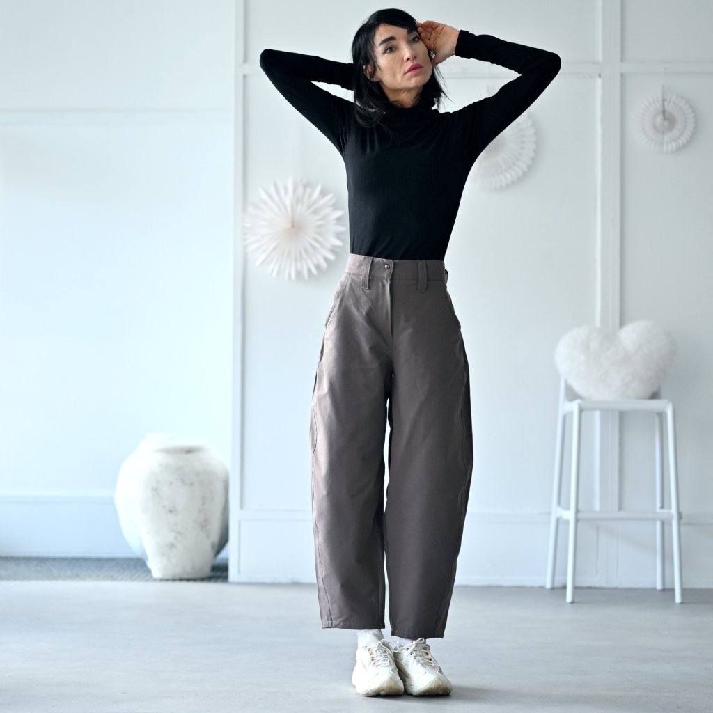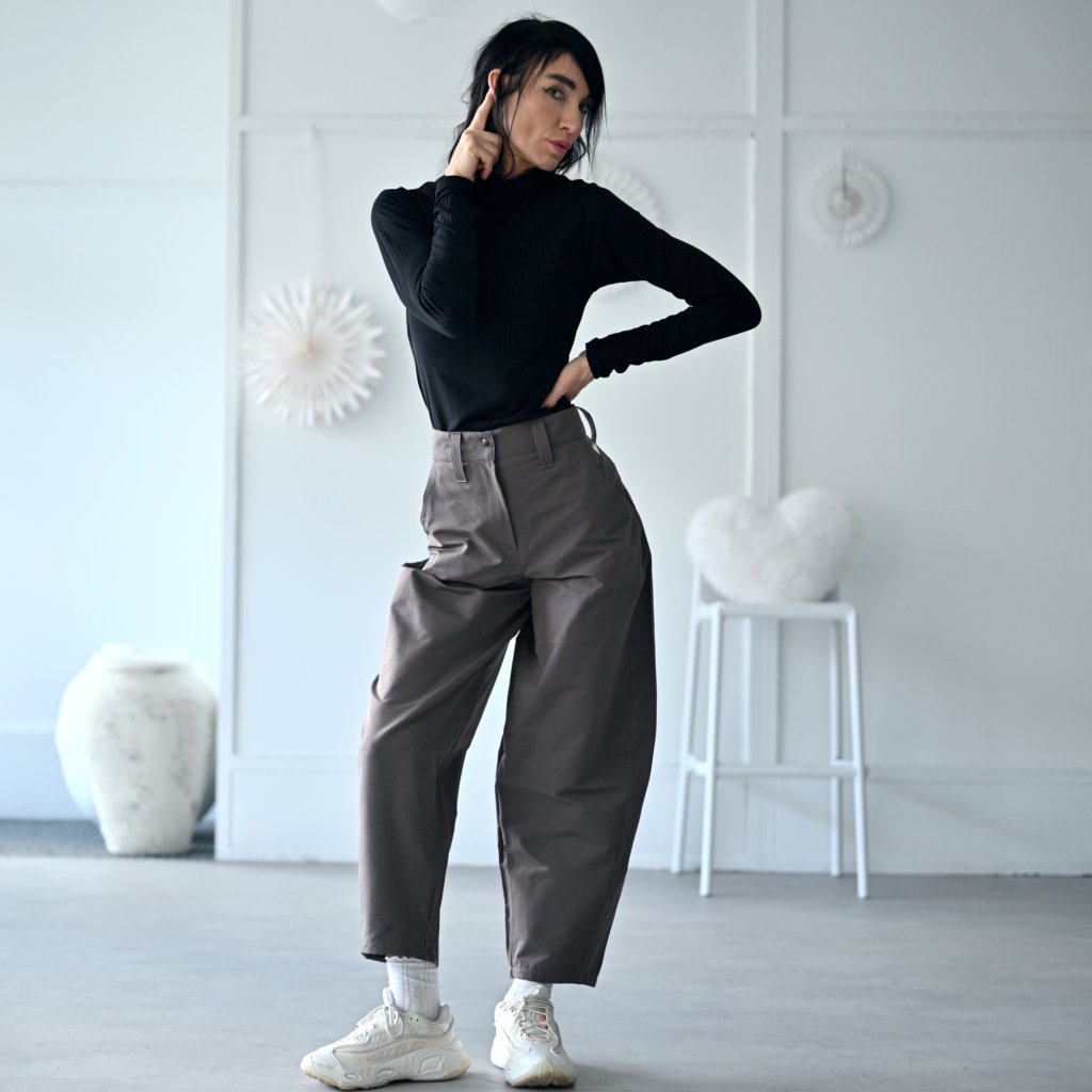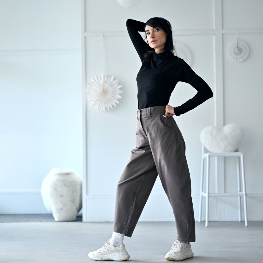 Kalhoty TIERRA "pohodlí a styl v jednom" barelové volnější kalhoty z bavlněné tkaniny s kapsami, pas je zřasen do pružné gumy, kalhoty jsou na zip + patentka. široké nohavice zúžené ve spodní části, všitý pruh dodává originální baggy look lichotící většině typům postav.