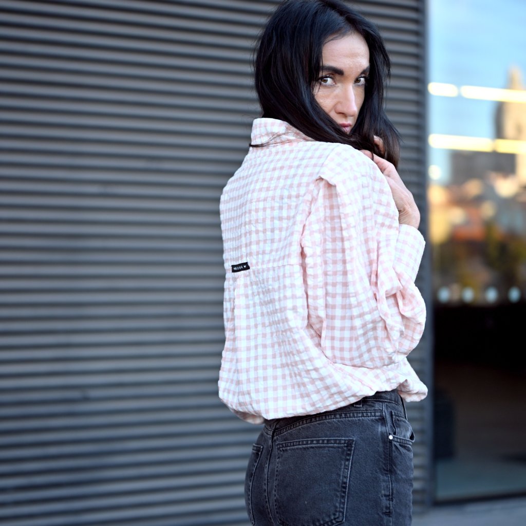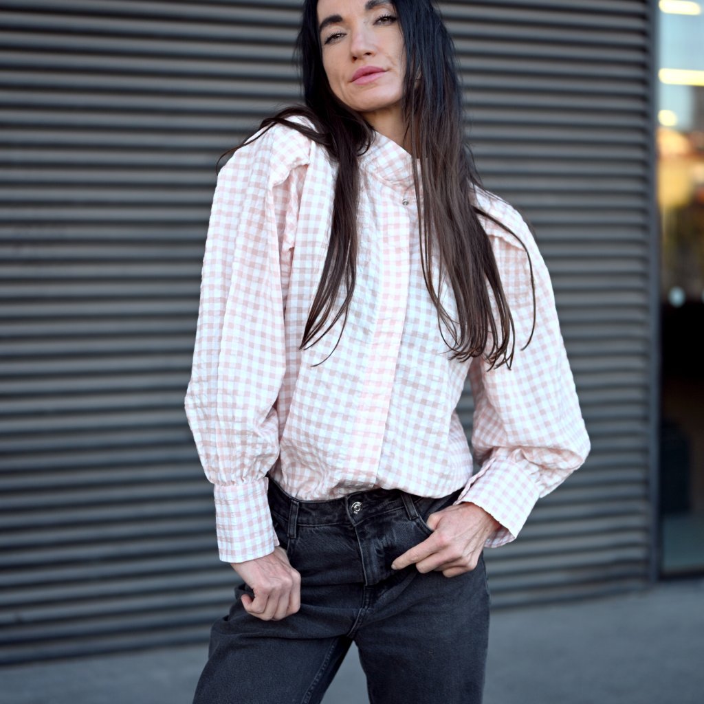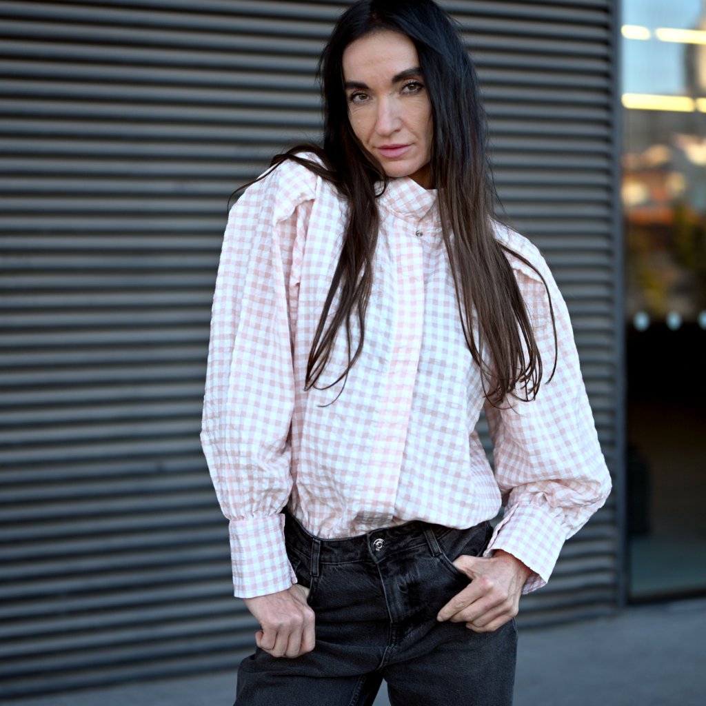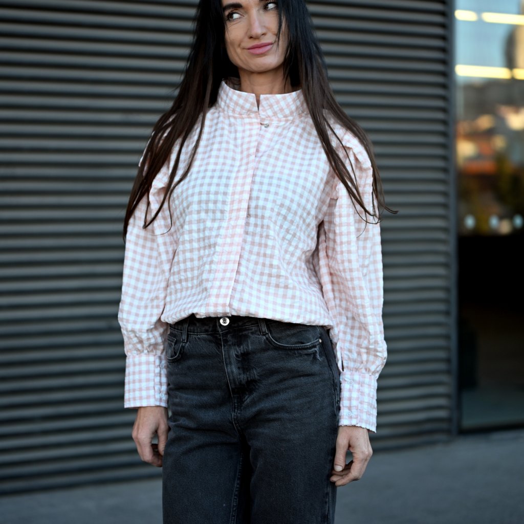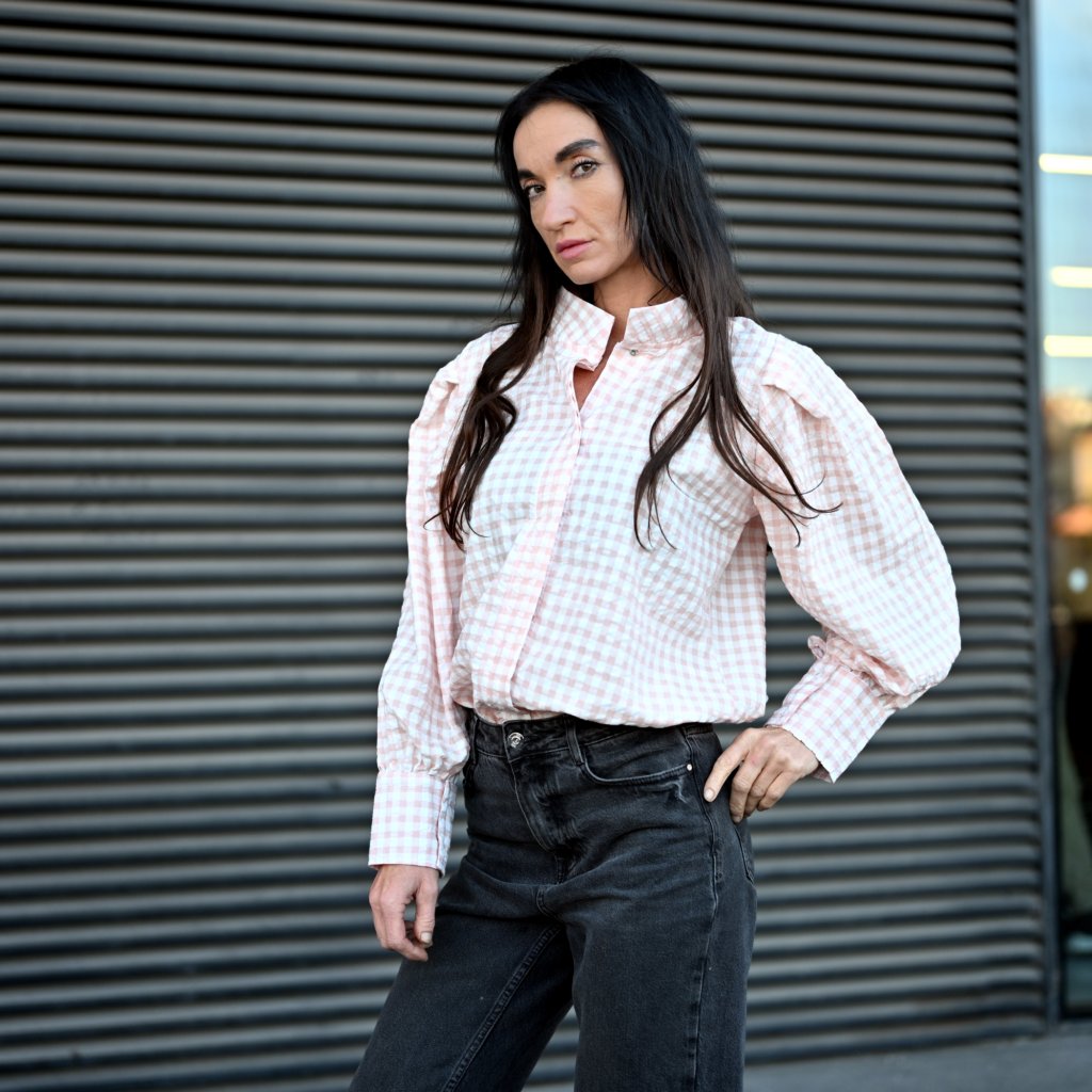 Košile Evaluna - je naší žhavou novinkou. Slušná elegantní košile s jemně nabíraným, dlouhým rukávem na zapínání patentkami. Límeček do stojáčku.
