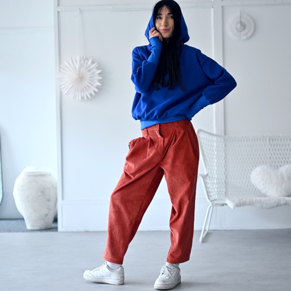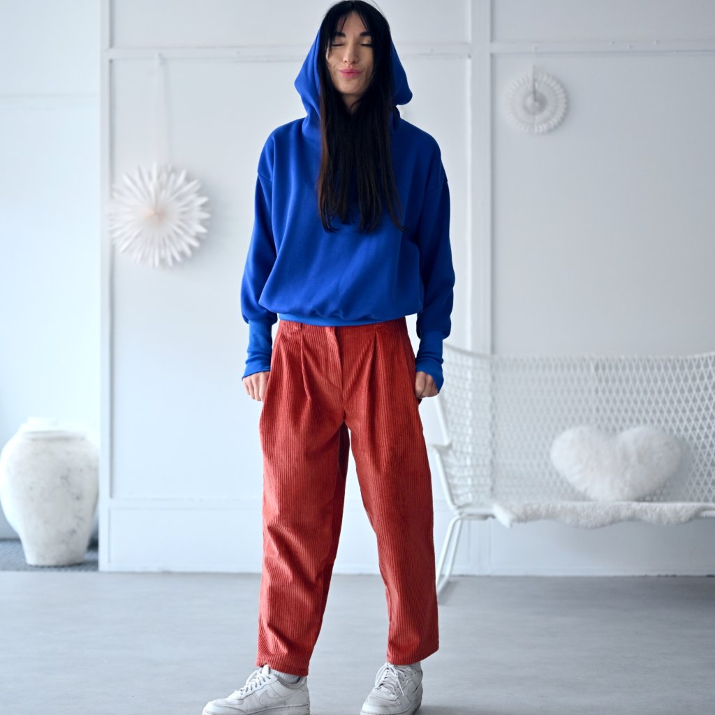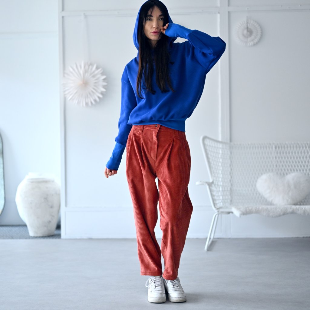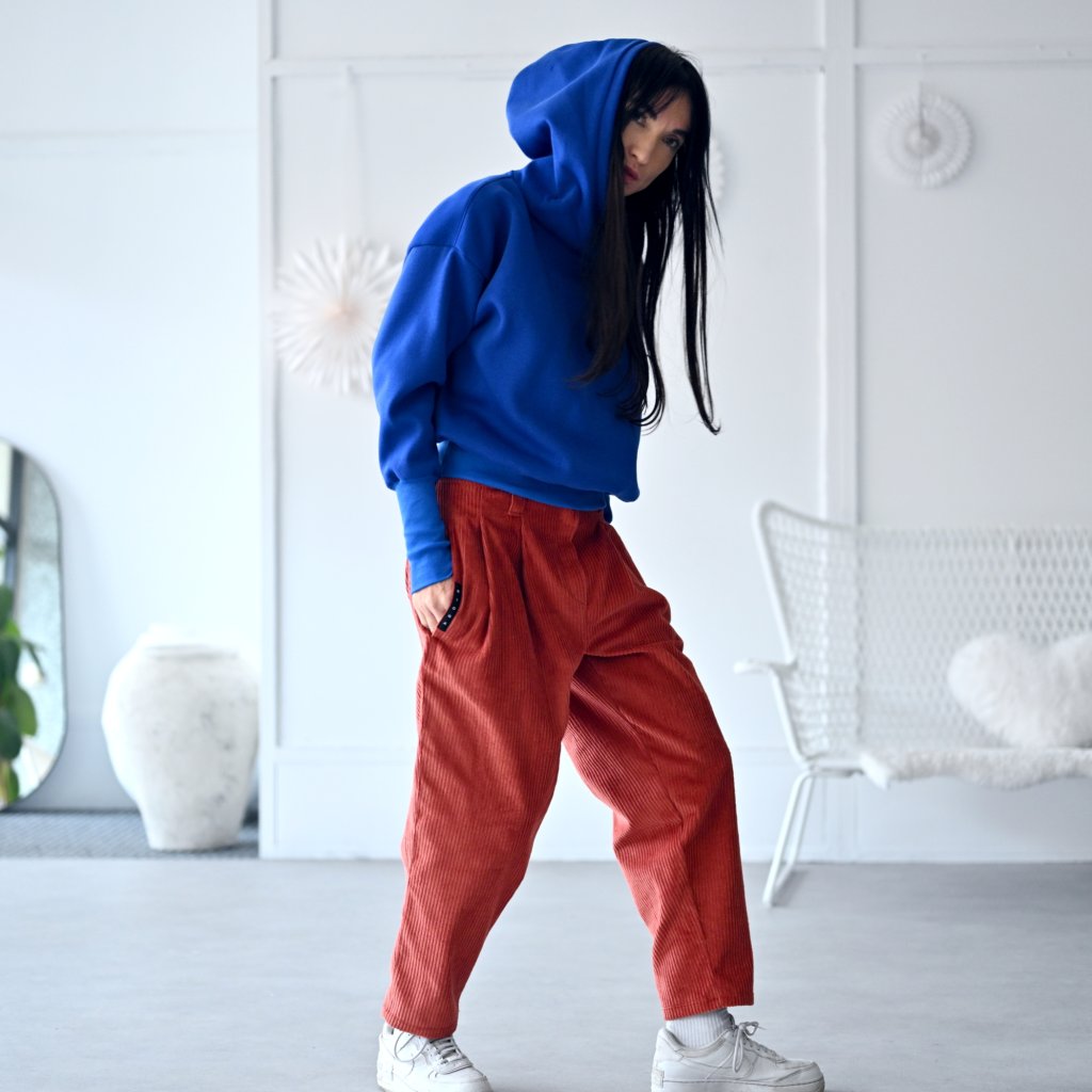 Mikina LOSIENTO s velkou kapucí, dlouhé žebrované úplety na rukávech a spodní části mikiny. Mikina bez kapes.