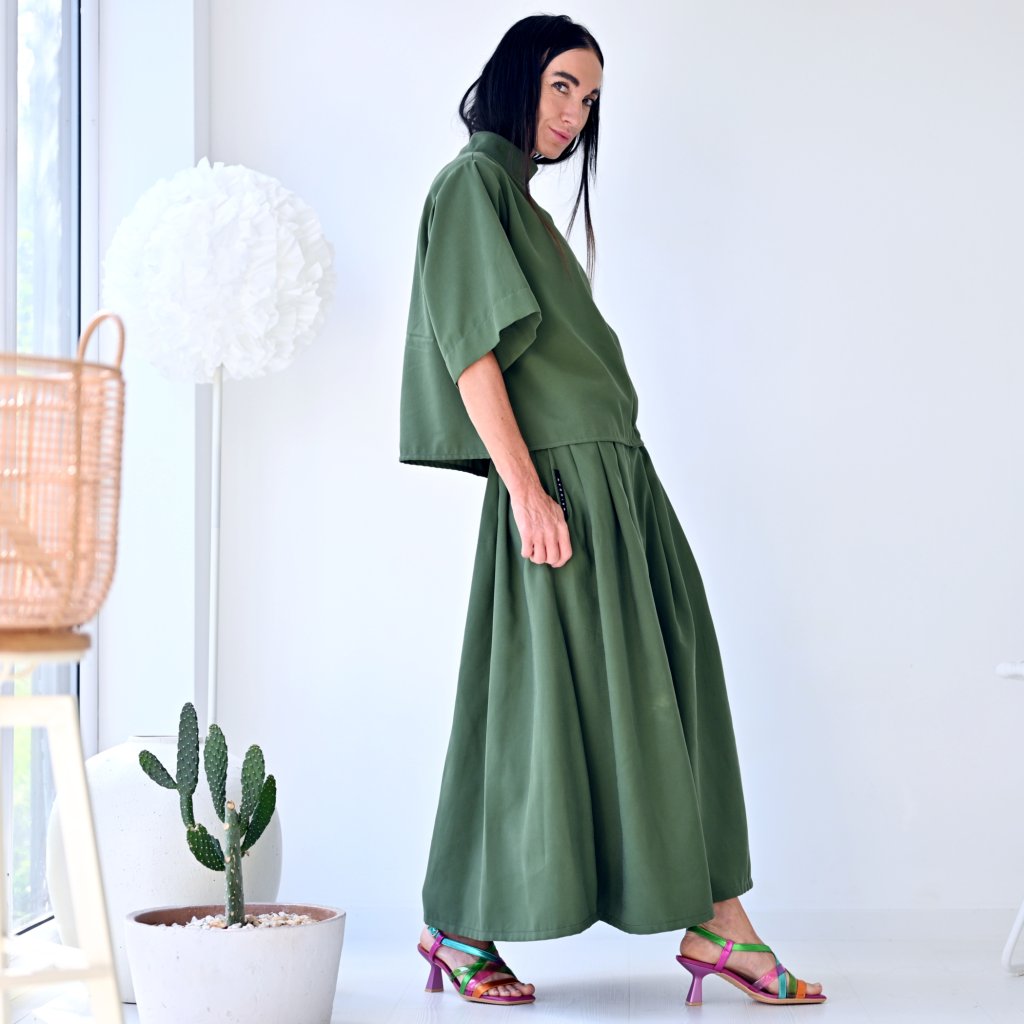 Se sukní jsme si pohráli do detailů. Sukně do pasu na patentku, pas jsme udělali opět s vůlí - všitá guma v pase je variabilní pro více typů postavy. Hlavní doménou je plisé - všité sklady, které působí elegantně a dodává sofistikovaný lool. Délka lehce nad kotníky. Kapsy jsou už samozřejmou záležitostí.