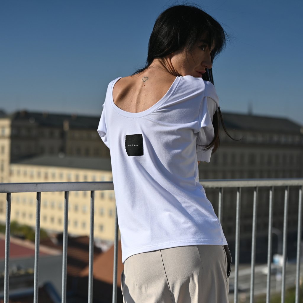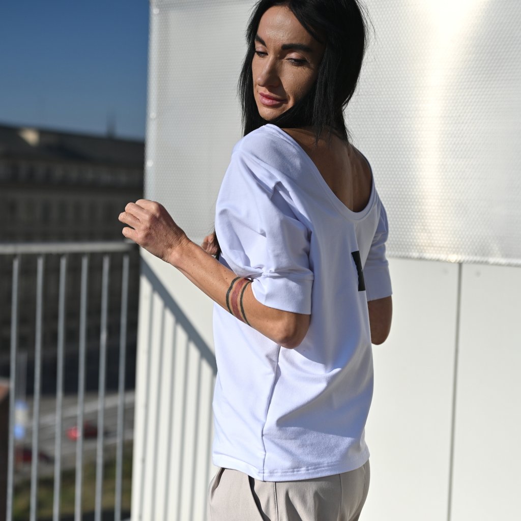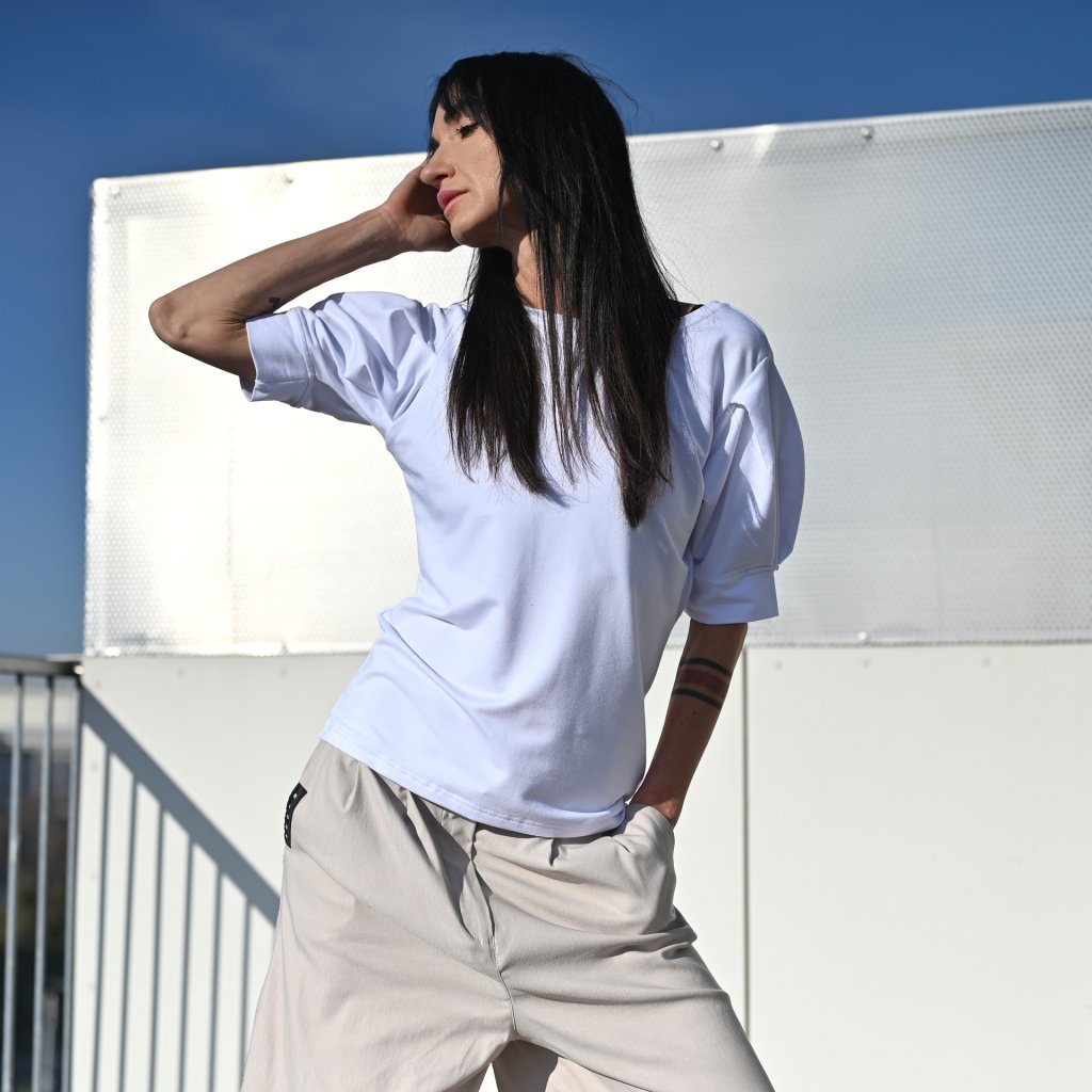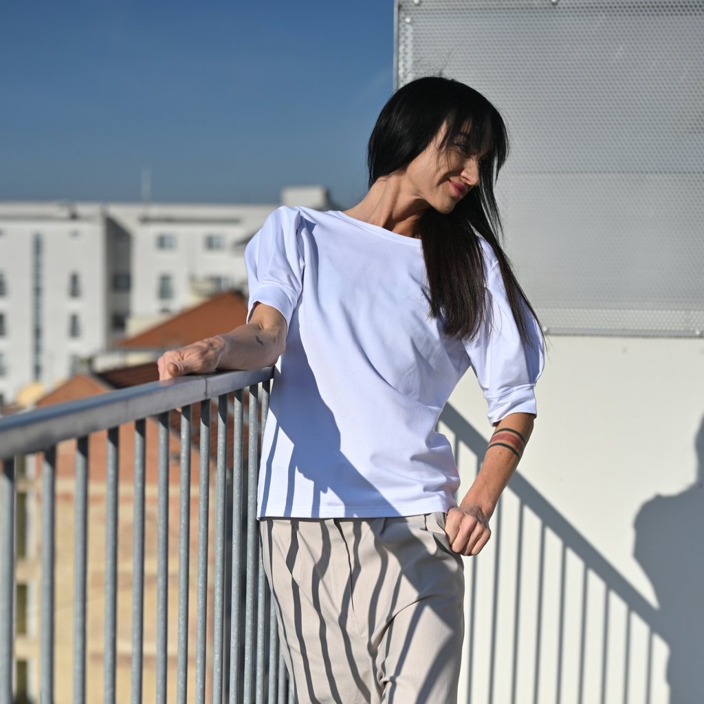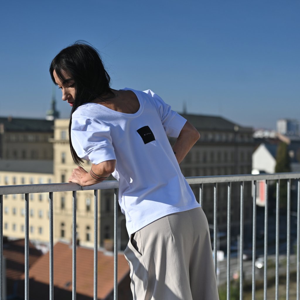 Top TRUENO EXKLUZIV TOPÍK z hladkého modalového materiálu. Jemně naskládané balonové rukávy, výraznější véčko na zádech, ale pořád je dost decentní, že není vidět prádlo.