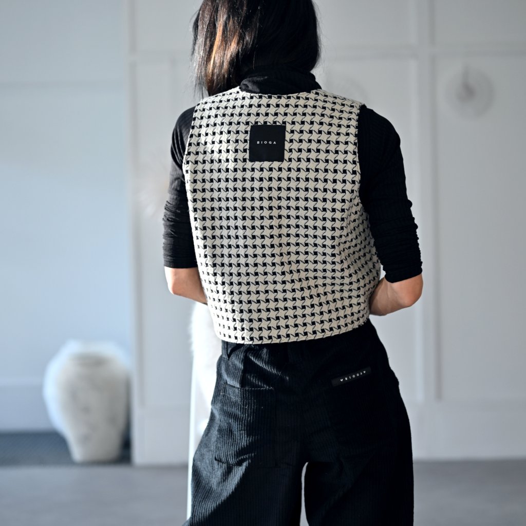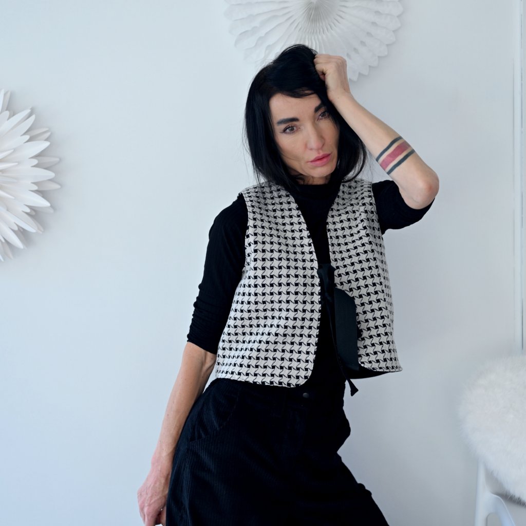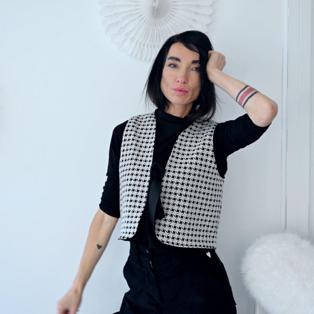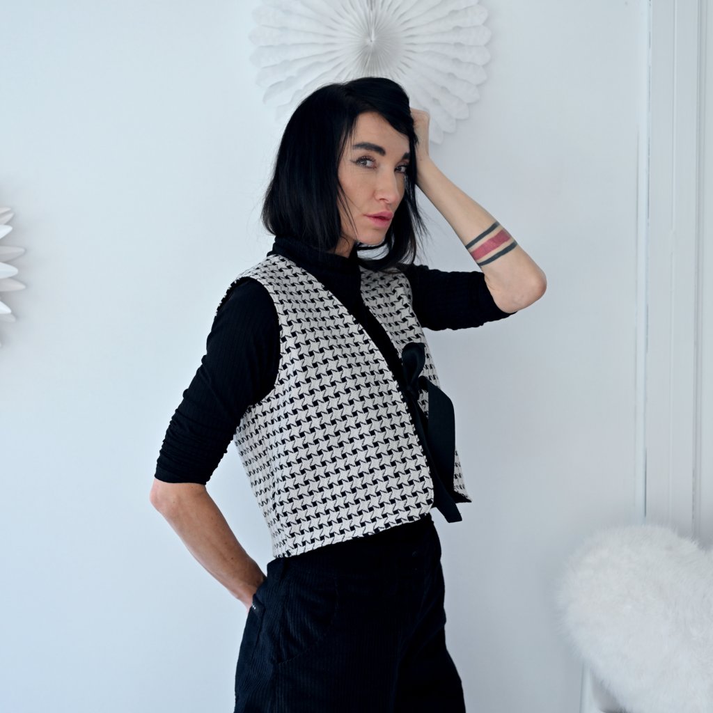 Vesta Bjork - Vesta z vlněného materialu+ bavlněná podšívka, můžete uvázat širokou bavlněnou stuhou na mašli nebo jen tak na suk. Zadní díl se dvěma záševky, díky kterým vesta krásně sedí.