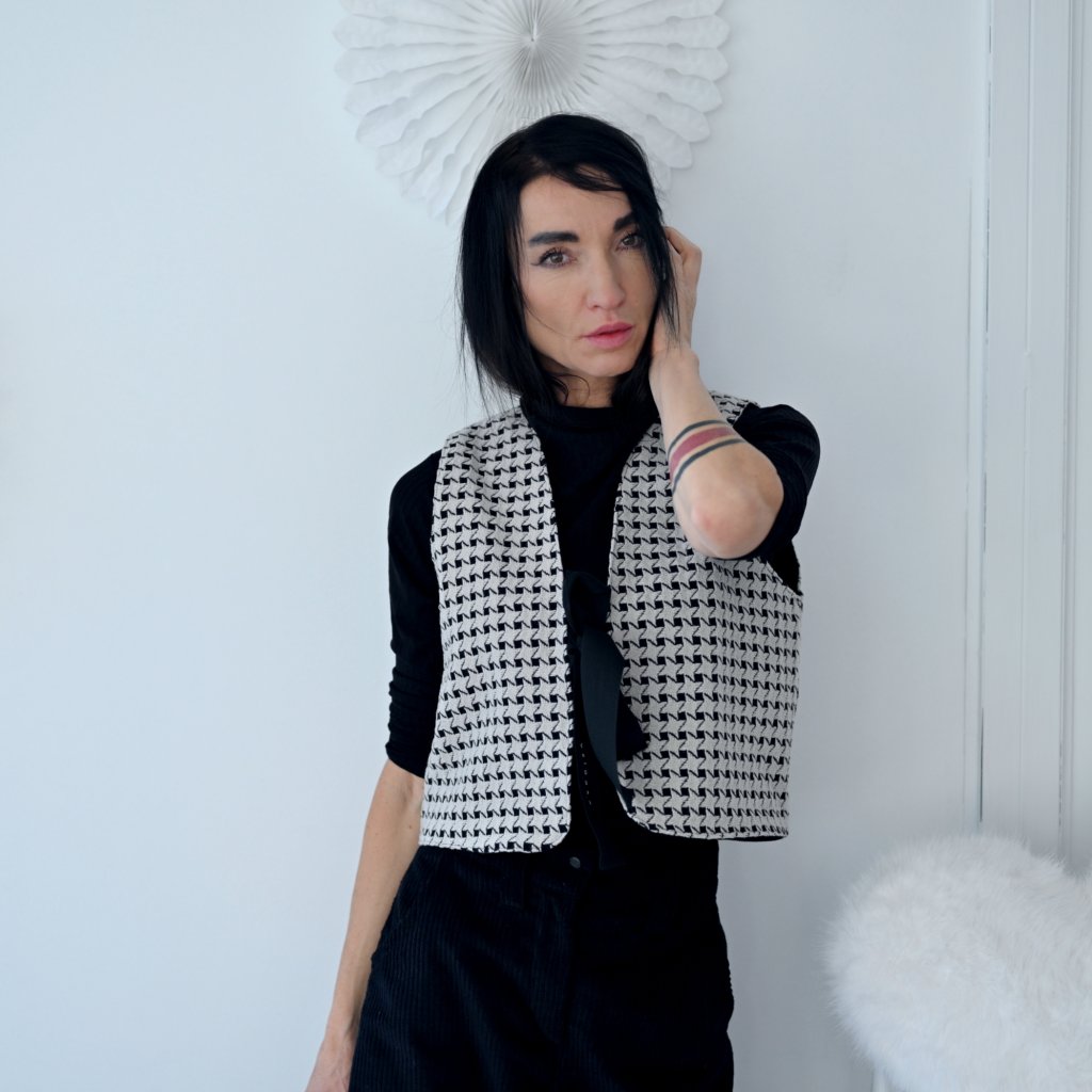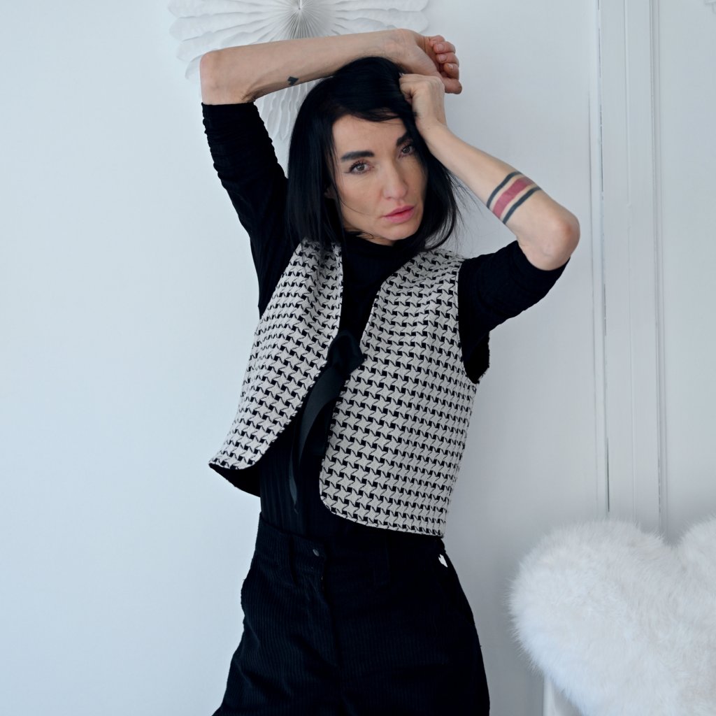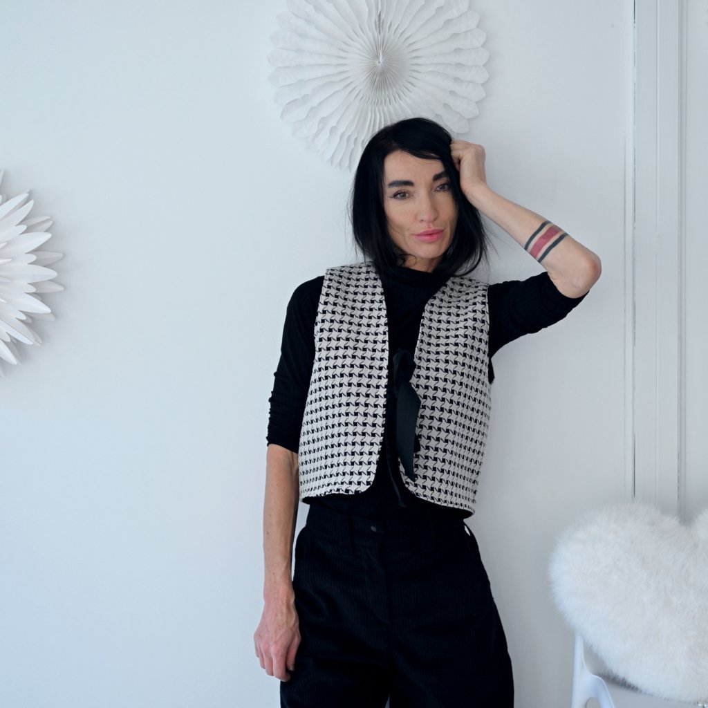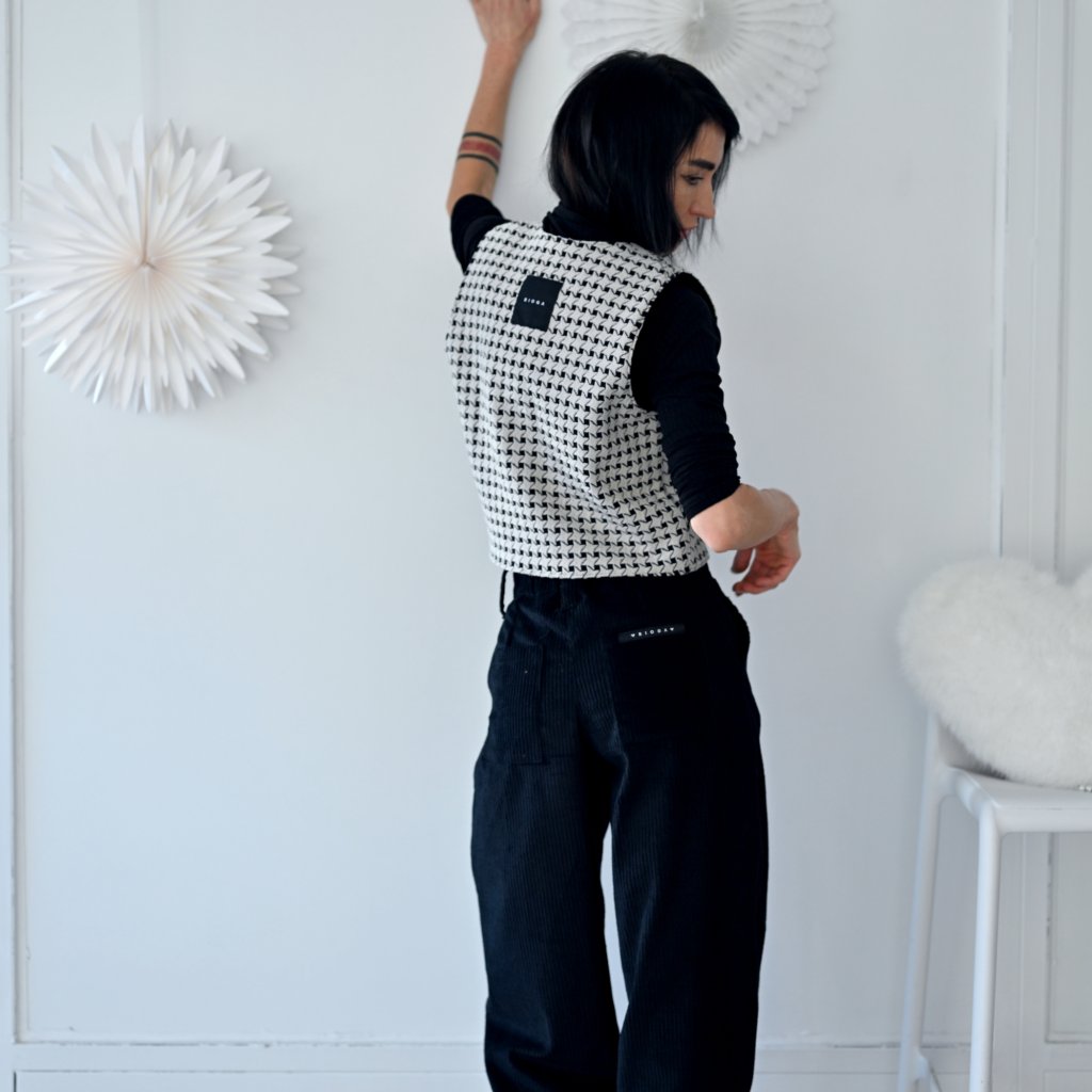 Vesta Bjork - Vesta z vlněného materialu+ bavlněná podšívka, můžete uvázat širokou bavlněnou stuhou na mašli nebo jen tak na suk. Zadní díl se dvěma záševky, díky kterým vesta krásně sedí.