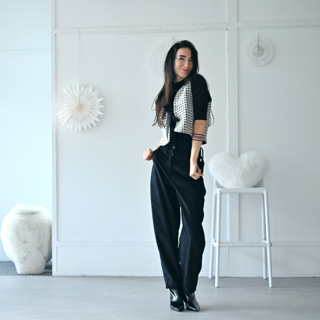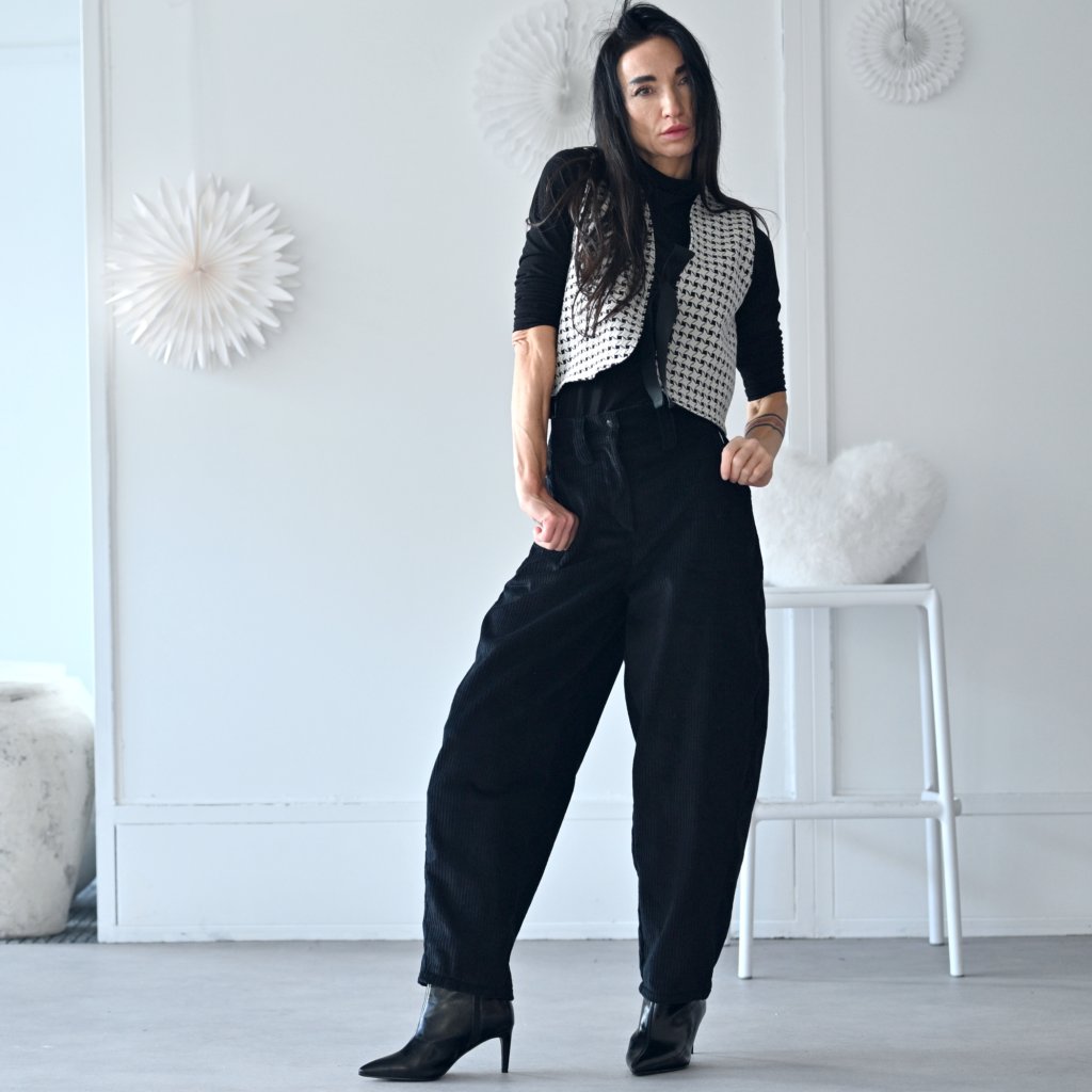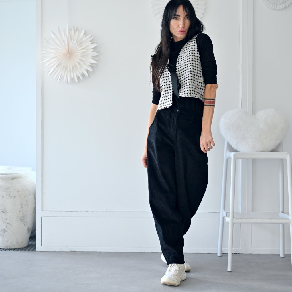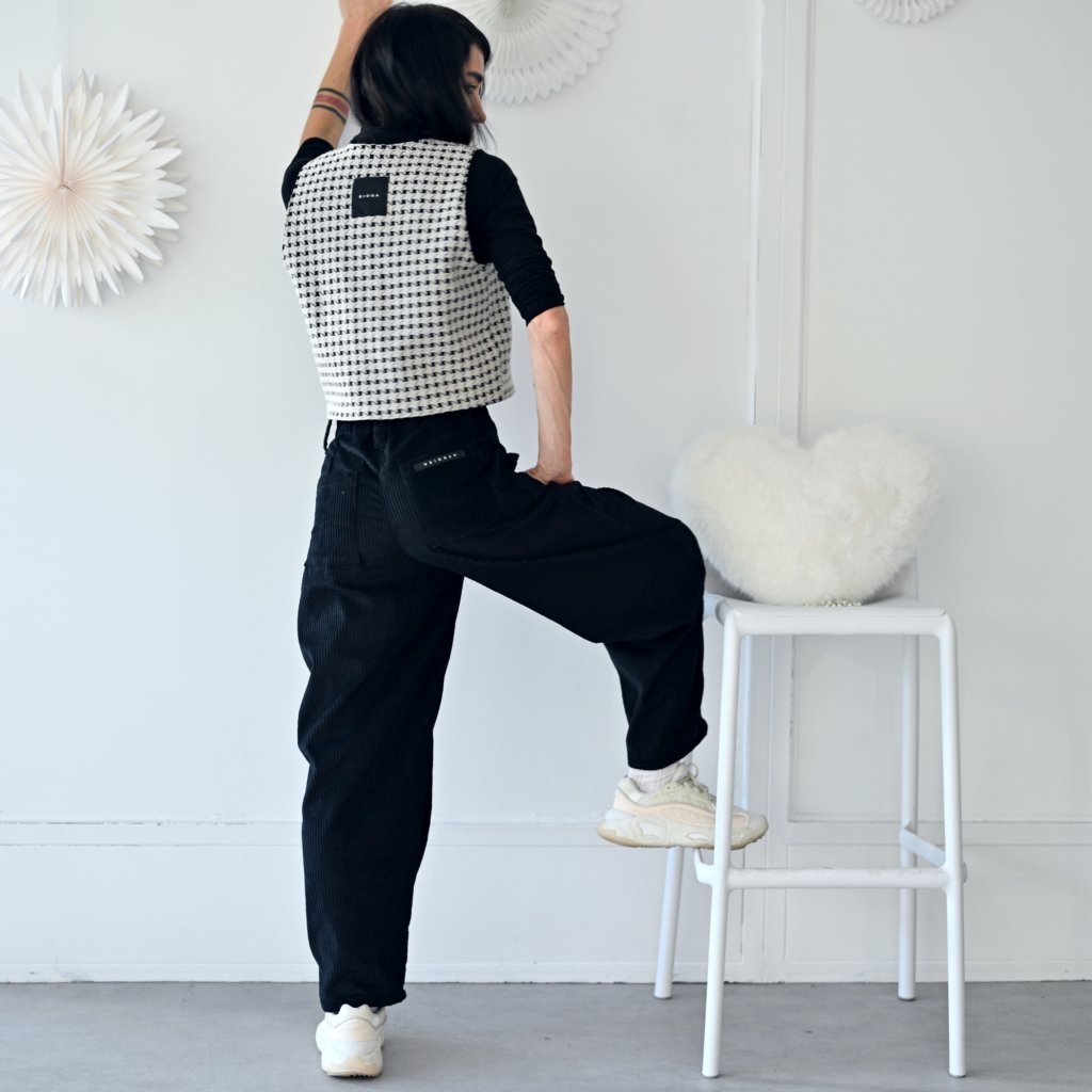 Vesta Bjork - Vesta z vlněného materialu+ bavlněná podšívka, můžete uvázat širokou bavlněnou stuhou na mašli nebo jen tak na suk. Zadní díl se dvěma záševky, díky kterým vesta krásně sedí.